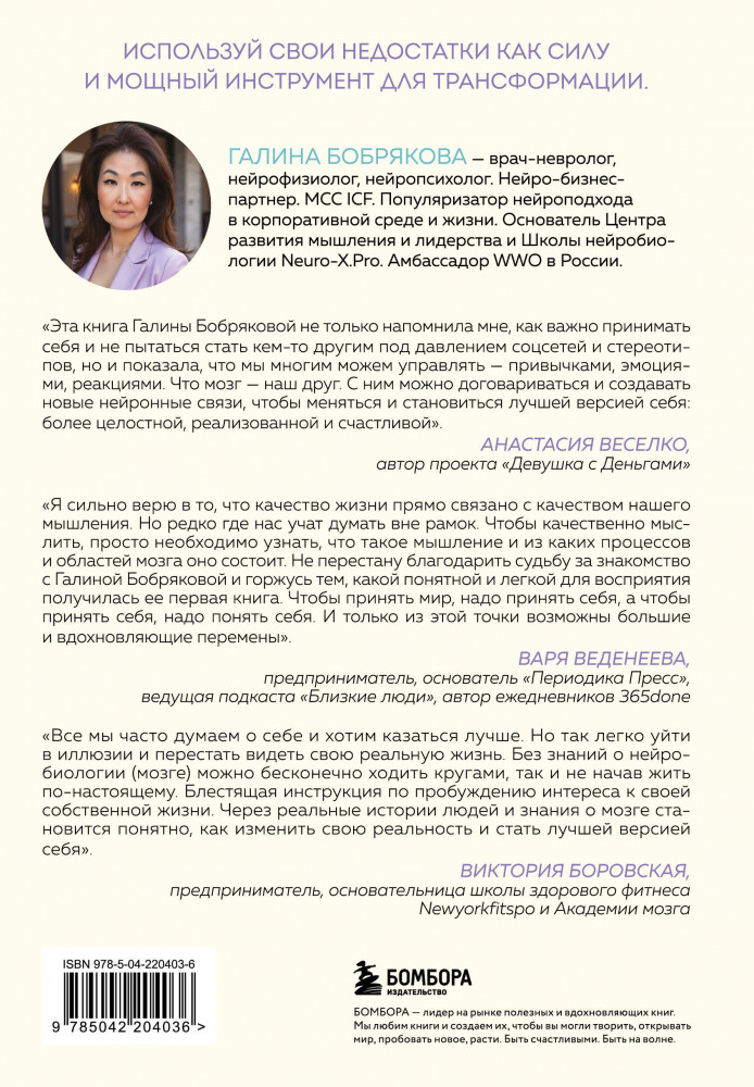 💳 Оплатить за товар можно при получении 🇰🇿 Есть бесплатная доставка по Казахстану 🎁 Копите бонусы с каждой покупки Серия: Жизнь с умом. Книги о мозге, которые улучшат жизнь Забудьте о прокрастинации, страхах, чрезмерном перфекционизме, боязни публичных выступлений и синдроме самозванца. Врач-невролог, нейробиолог и мастер-коуч MCC ICF Галина Бобрякова собрала в своей книге самые актуальные знания о работе мозга и превратила их в мощную систему практик, упражнений и реальных кейсов. Это руководство поможет вам «перезагрузиться» и создать лучшую версию себя. Вы научитесь перепрограммировать мышление, формировать полезные привычки и выстраивать новые сценарии поведения. И все начинается с принятия себя — ведь именно любовь к себе раскрывает ваш настоящий потенциал. |