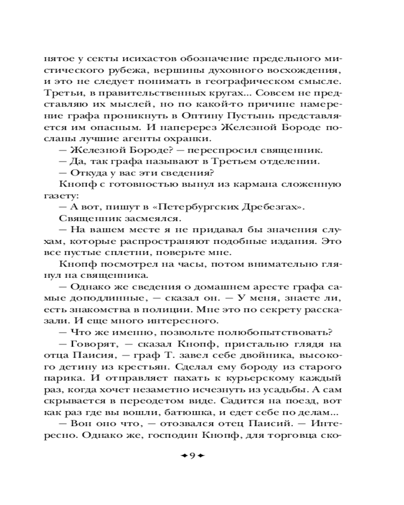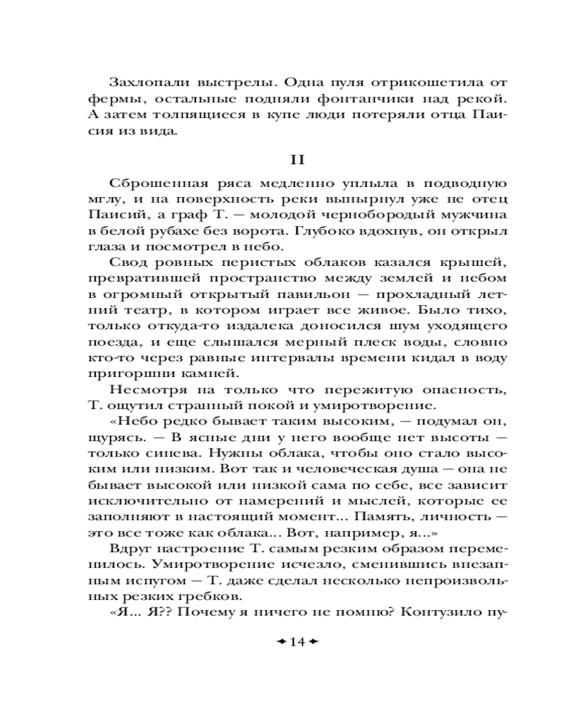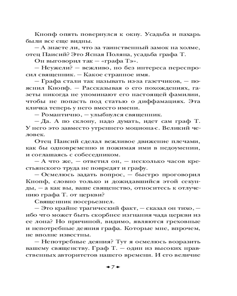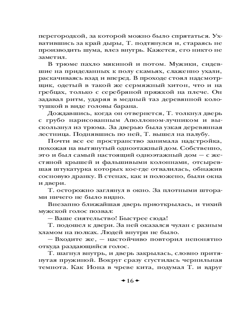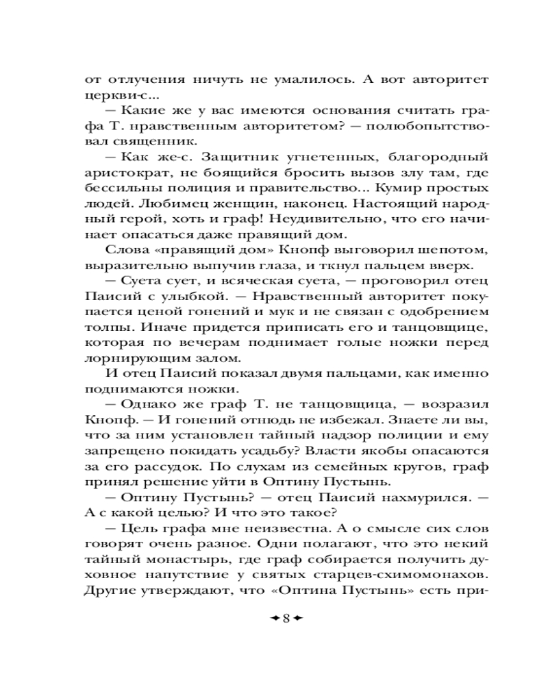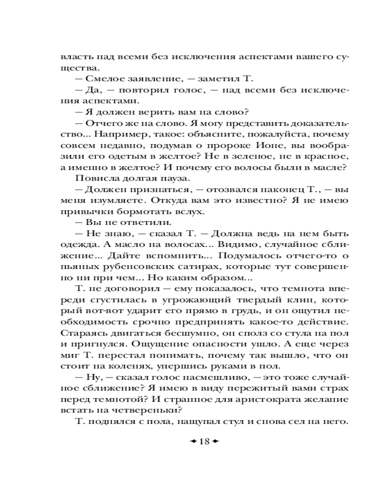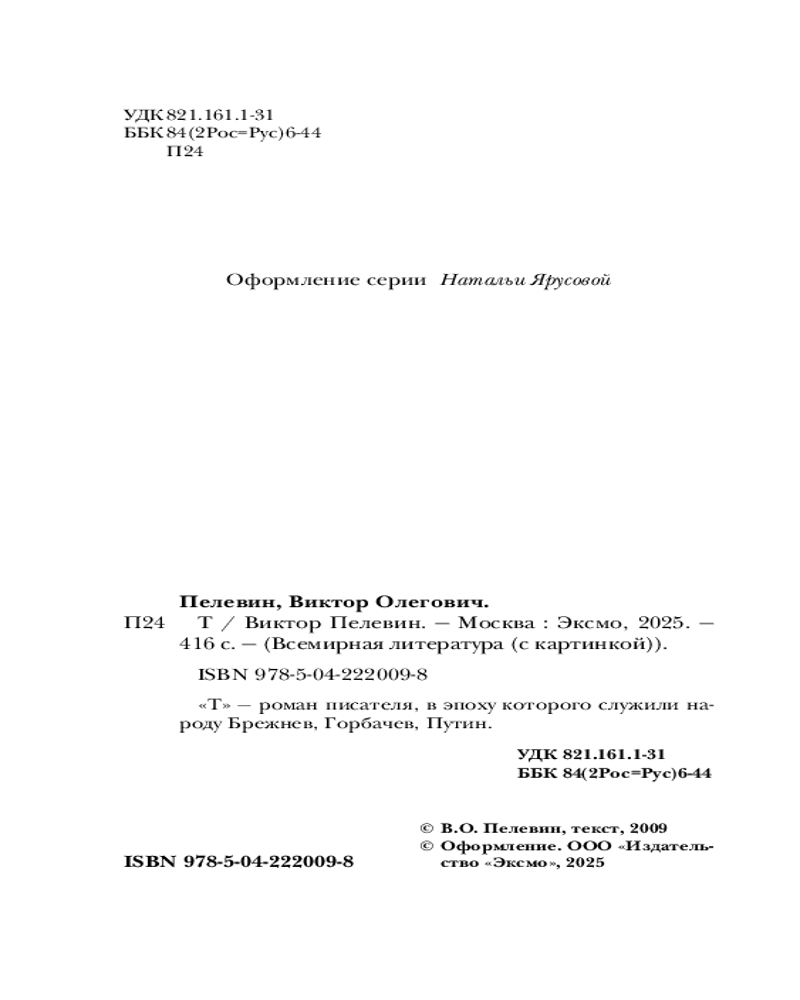 Серия: Всемирная литература (новое оформление) Роман повествует о пути мастера боевых искусств графа Т. (вероятно, имеется в виду Лев Толстой), который бежал из своего дома от царской охранки и с неведомой ему целью пробирается в Оптину Пустынь, которая в контексте данного романа обретает черты не знаменитой обители православия, а то ли некой Шамбалы, то ли непонятного места духовного просветления, существующего в реальном мире. Потом «оптина» превращается в «соловьёвскую», и тут уже всё становится ещё более непонятным и запутанным. По дороге в Оптину Пустынь граф Т. встречает каббалистическое существо Ариэля. Ариэль вместе с пятью литературными неграми сами придумывают и пишут рассказ о графе Т., о чём Ариэль и рассказывает графу. Однако Т. не очень нравится быть в подчинении у каких-то пятерых сомнительных типов. А потому он пытается перехватить у них инициативу и сам стать автором. Роман Виктора Пелевина стал финалистом конкурса национальной литературной премии «Большая книга» и занял в итоге третье место, а в народном голосовании — первое место. |