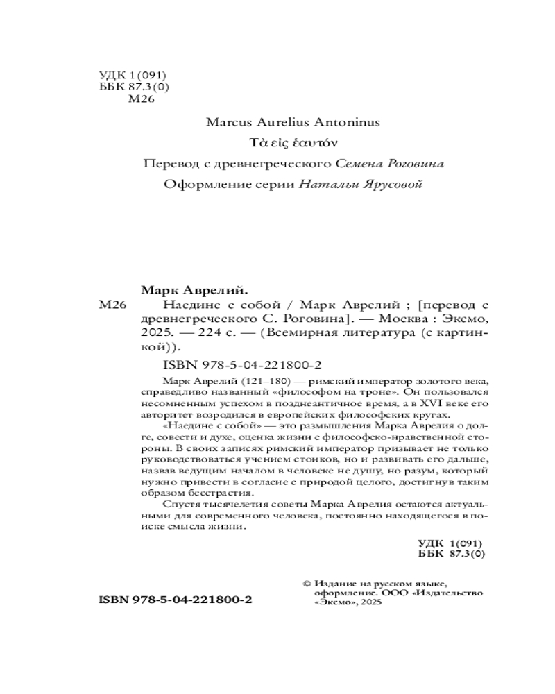 Серия: Всемирная литература (новое оформление) Марк Аврелий (121-180) — римский император «Золотого века», справедливо названный «философом на троне». Он пользовался несомненным успехом в позднеантичное время, а в XVI веке его авторитет возродился в европейских философских кругах. «Наедине с собой» — это размышления Марка Аврелия о долге, совести и духе, оценка жизни с философско-нравственной стороны. В своих записях римский император призывает руководствоваться учением стоиков, но и развивать его дальше, назвав ведущим началом в человеке не душу, но разум, который нужно привести в согласие с природой целого, достигнув таким образом бесстрастия. Спустя тысячелетия советы Марка Аврелия остаются актуальными для современного человека, постоянно находящегося в поиске смысла жизни. |
