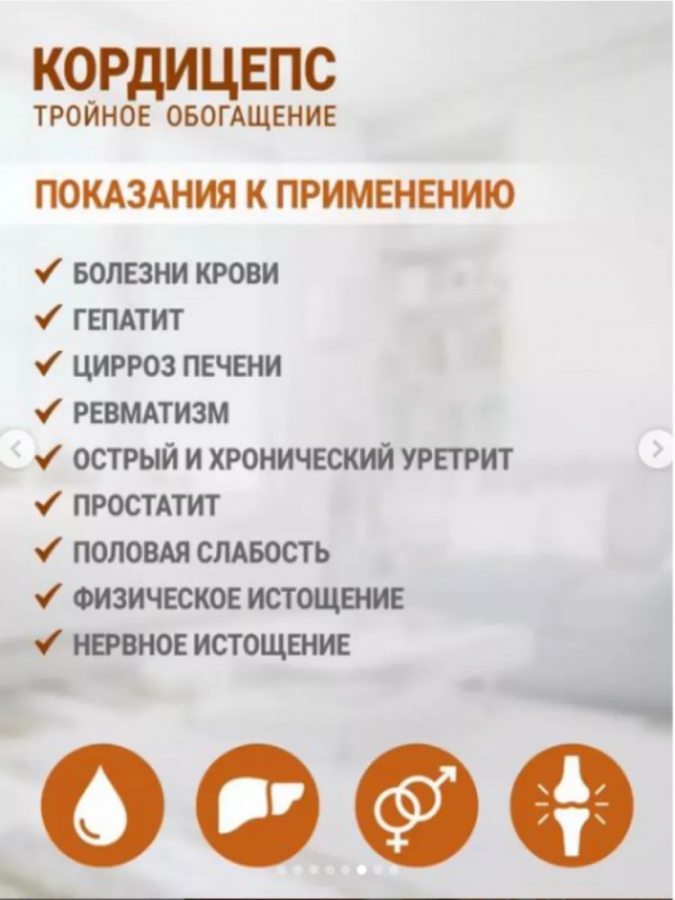 В данный момент этот товар отсутствует в продаже. Возможно, у нас найдется аналогичный или похожий товар здесь. Комплекс для иммунитета. Кордицепс восстанавливает иммунную систему, повышает стойкость к простуде и инфекциям, оздоравливает организм. Значительно улучшает самочувствие и умножает физическую выносливость. Нормализует сон и устраняет хроническую усталость. Хорошо помогает при хронических бронхитах и других заболеваниях органов дыхания. Эффективен для лечения и профилактики болезней мочеполовой системы. Помогает в борьбе с раковыми клетками и содействует быстрому восстановлению здоровья в послеоперационный период.