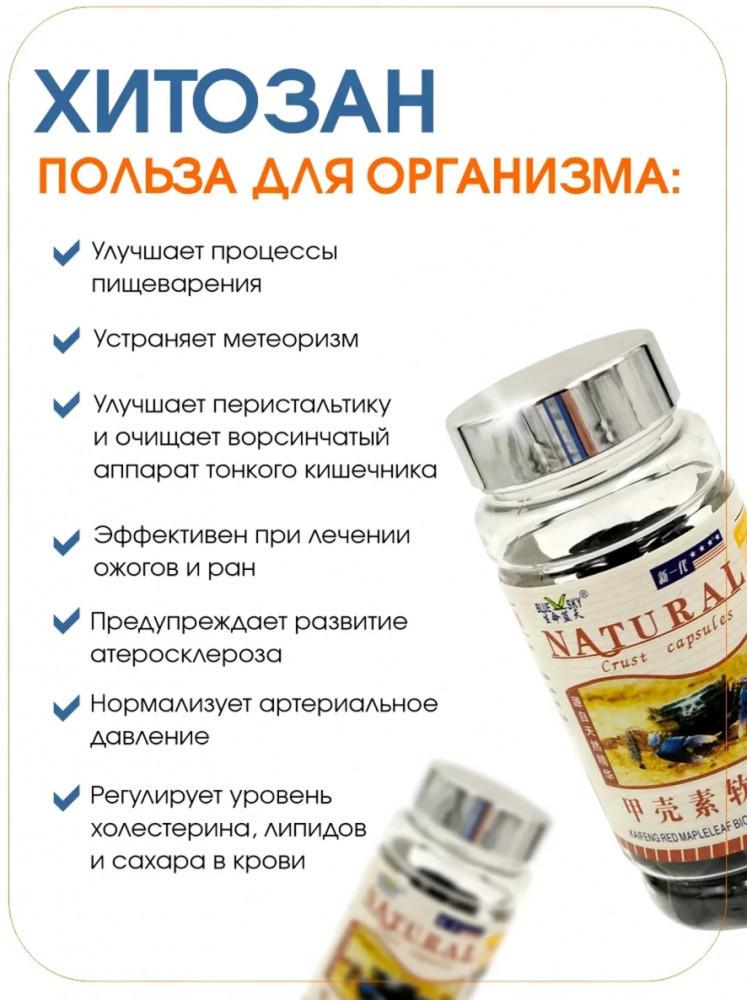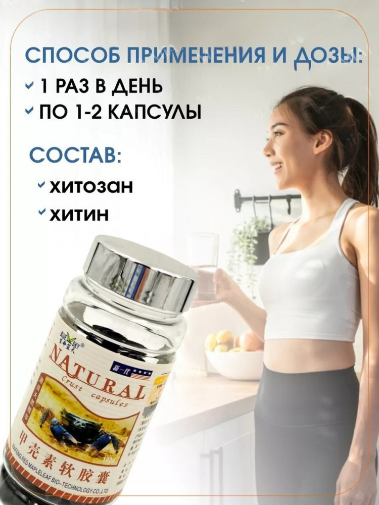 Хитозан состоит из натуральных компонентов и оказывают положительное влияние на ускорение метаболизма, стимуляцию кровообращения и регуляцию обмена веществ. Это позволяет эффективно и безопасно снижает аппетит и в итоге снизить вес, не прибегая к строгим диетам. Эффективный жиросжигатель: Хитозан, блокатор жира, отлично подходит для женщин и мужчин, желающих быстро сбросить вес. Очищение детокс организма: помимо функции сжигания жира, хитозан в капсулах способствует detox очищению организма, улучшая пищеварение. Контроль и снижение аппетита: Таблетки помогут уменьшить чувство голода, что сделает процесс похудения комфортнее. Контроль холестерина: таблетки могут помочь снизить уровень холестерина в крови. Для всех: хитозан можно использоваться как мужчинами, так и женщинами. Однако стоит отметить, что хотя хитозан обладает этими полезными свойствами, его использование в качестве единственного средства для похудения не гарантирует быстрого и эффективного снижения веса. Эффективное похудение требует комплексного подхода, включая правильное питание, физическую активность и здоровый образ жизни. Хитозан, 100 капсул в 1 упаковке — это продукт, который используется для похудения, снижения веса и подавления чувства голода.
