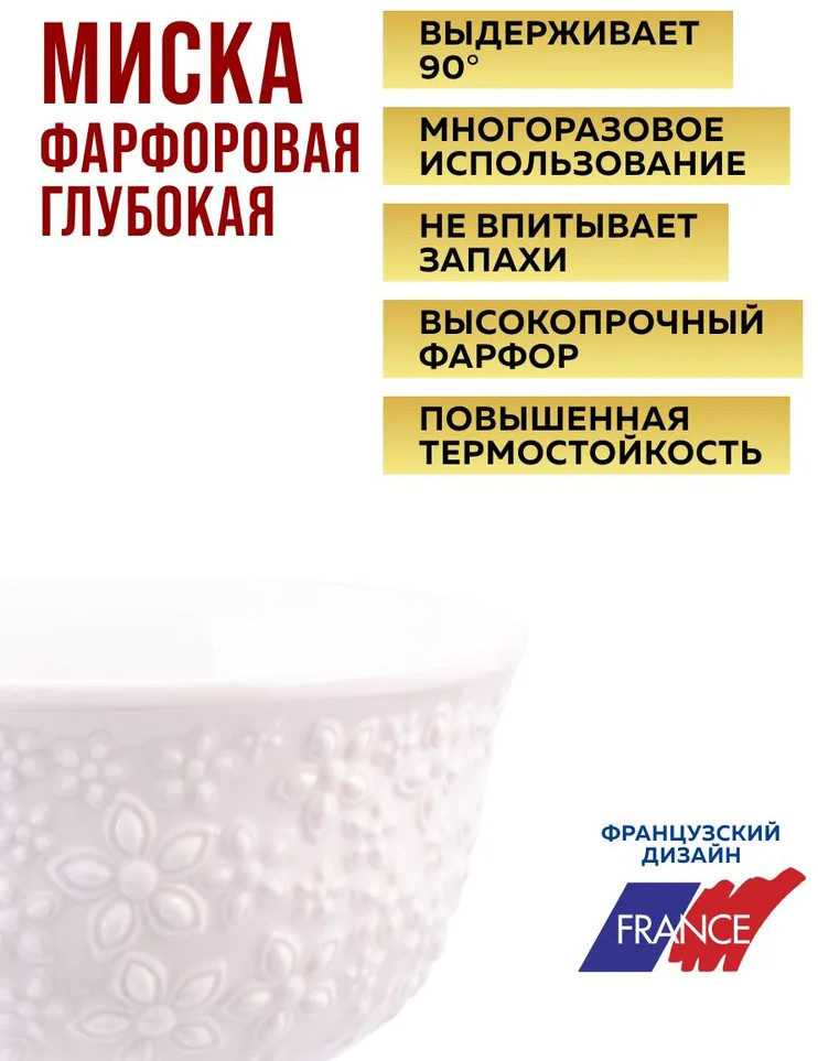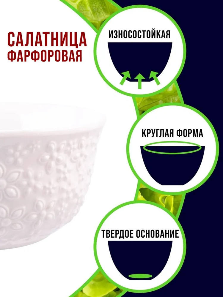 Изготовлены из высококачественного фарфора по передовым технологиям, поэтому продукты в ней сохраняют свои полезные свойства, натуральный вкус и восхитительный аромат. Салатники для кухни отличаются практичностью и долговечностью даже после длительного использования. Обладая неповторимостью и уникально продуманным дизайном, украшен орнаментом, блюдо будет идеально гармонировать с любой кухонной посудой и подчеркнет ваш безупречный вкус и внимание к деталям. Фарфоровые тарелки для салата — красивая посуда на каждый день и незаменимая кухонная утварь для любителей кулинарии!