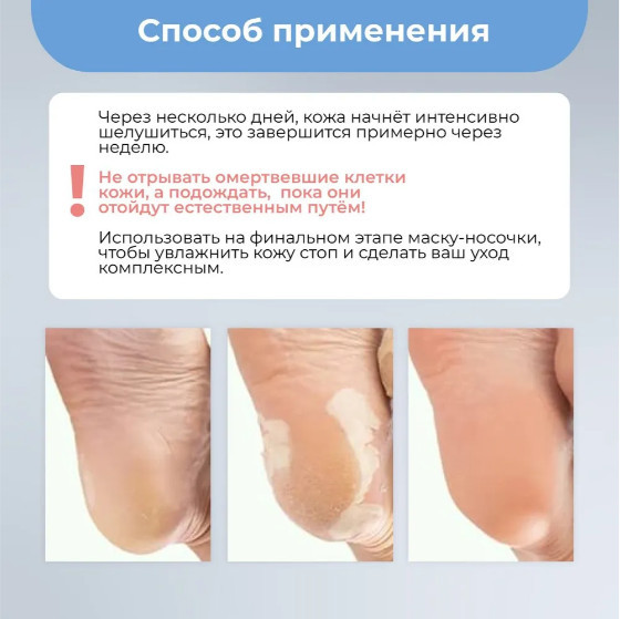💳 Оплатить за товар можно при получении 🇰🇿 Есть бесплатная доставка по Казахстану от 1 дня 🎁 Копите бонусы с каждой покупки Пилинг-маска для пяток эффективно удаляет сухие и мертвые слои кожи, ликвидирует шероховатости, натоптыши и мозоли, производит глубокое очищение кожи ног, возвращает им нежность, мягкость и внешнюю привлекательность. Это простой в использовании пакет, который естественным образом удаляет омертвевшие клетки кожи со стоп через 2–3 дня после использования. Это помогает сохранить ваши пятки такими же аккуратными и гладкими. |