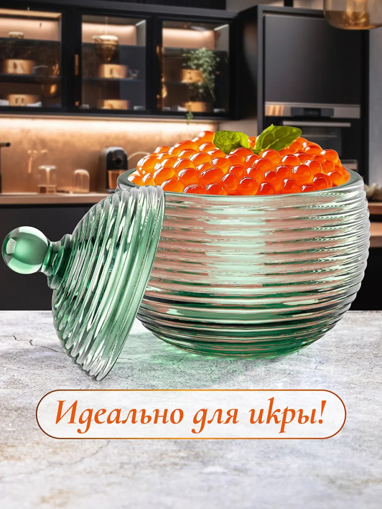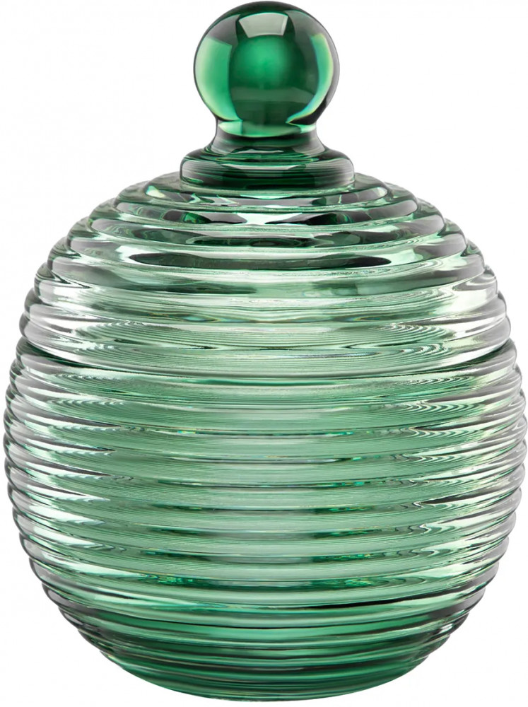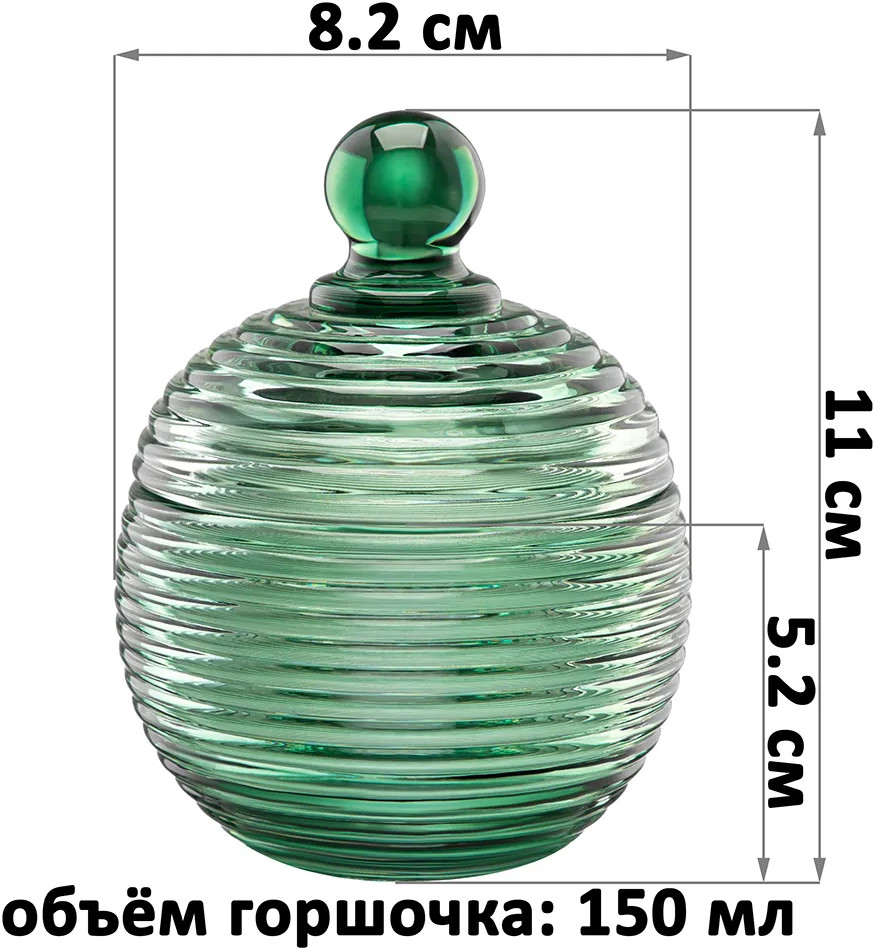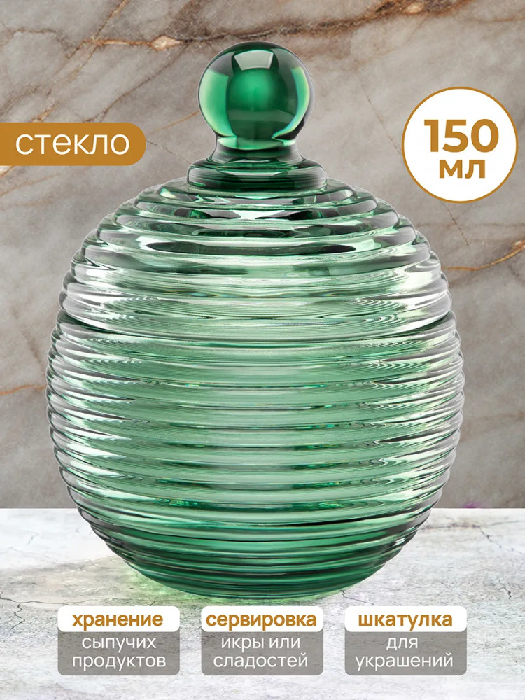 Баночка зелёного цвета с полосатым рельефом подойдёт для хранения мёда, варенья, сахара и соли. Можно использовать её как ёмкость для чая, кофе и других сыпучих продуктов. Декоративная баночка круглой формы станет гармоничным дополнением при сервировке вашего стола как в будни, так и на праздник. Красивый дизайн позволит использовать её не только для хранения продуктов, но и для подачи на стол. Положите в неё конфеты или икру, чтобы удивить гостей изящной сервировкой. Стеклянную ёмкость с крышечкой можно использовать не только как сахарницу, икорницу или соусник, но и для специй и приправ. Это позволит держать под рукой всё необходимое во время приготовления и приёма пищи. На даче медовница будет незаменимой для семейного чаепития, а также подойдёт для подачи ягод. В качестве альтернативы красивую вазочку с крышкой можно использовать как шкатулку или органайзер. Сложите в неё украшения и любые маленькие предметы. Подходит в роли стакана для свечи.