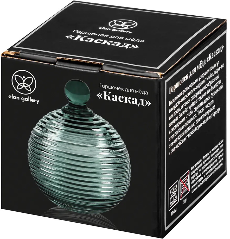 Горшочек для мёда Elan Gallery «Каскад» с крышкой выполнен из стекла и украшен декоративным рельефным узором в виде горизонтальных полосок. Размер изделия — 8,2×8,2×11 см, объём — 150 мл. Высота без крышки — 5,2 см.