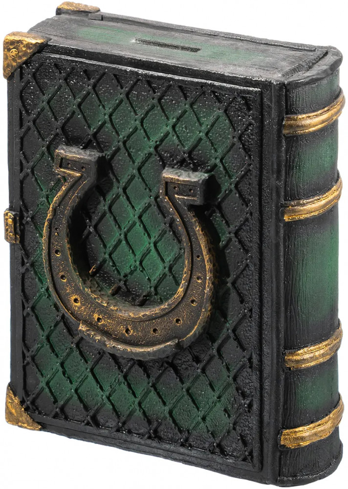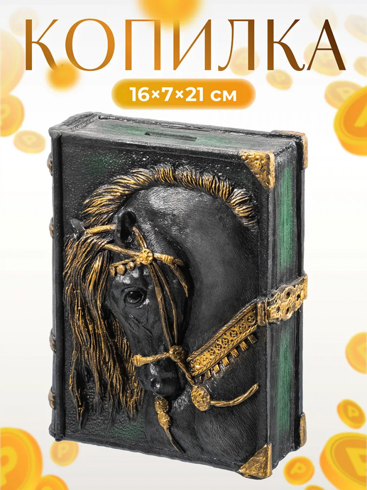 Копилка «Лошадь» от Elan Gallery поможет вам организовать хранение ваших финансов. Размер изделия — 16×7×21 см. Фигурка имеет необычную форму тёмно-зелёной книжки. На одной стороне обложки красуется рельефный силуэт чёрного коня в золотистой сбруе. На другой — золотистая подкова. Выполнена из гипса. Это классическая копилка, которую нужно разбить, чтобы достать сбережения. Можно использовать как детскую — она поможет ребёнку развить терпение и бережное отношение к средствам. Позволит хранить деньги в разных форматах — как в виде монет, так и бумажными купюрами.