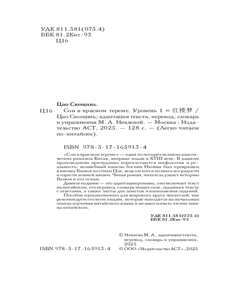 💳 Оплатить за товар можно при получении 🇰🇿 Есть бесплатная доставка по Казахстану от 1 дня 🎁 Копите бонусы с каждой покупки Серия: Легко читаем по-китайски «Сон в красном тереме» — один из четырёх великих классических романов Китая, впервые издан в XVIII веке. В данном произведении причудливо переплетаются мифология и реальность: волшебный камень богини Нюйвы был превращен в юношу Баоюя из семьи Цзя, ведь он хотел познать все радости и горести земной жизни. Читая роман, читатель узнает историю Баоюя и его семьи. Данное издание — это адаптация романа, оно включает текст на китайском, его перевод, словарь новых слов, задания к тексту с ответами, а также листы для заметок и выполнения заданий. Пособие предназначено для широкого круга читателей, мы рекомендуем его всем людям, которые находятся на начальных этапах изучения китайского языка и желают начать чтение книг на китайском. |