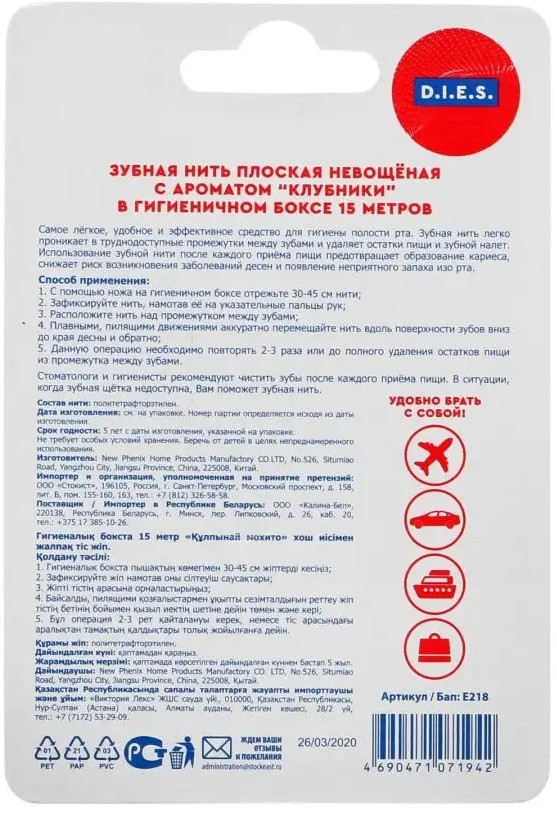 D.I.E.S. Зубная нить невощеная «Клубничный мохито»