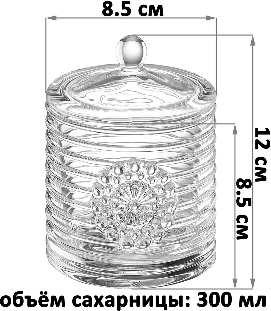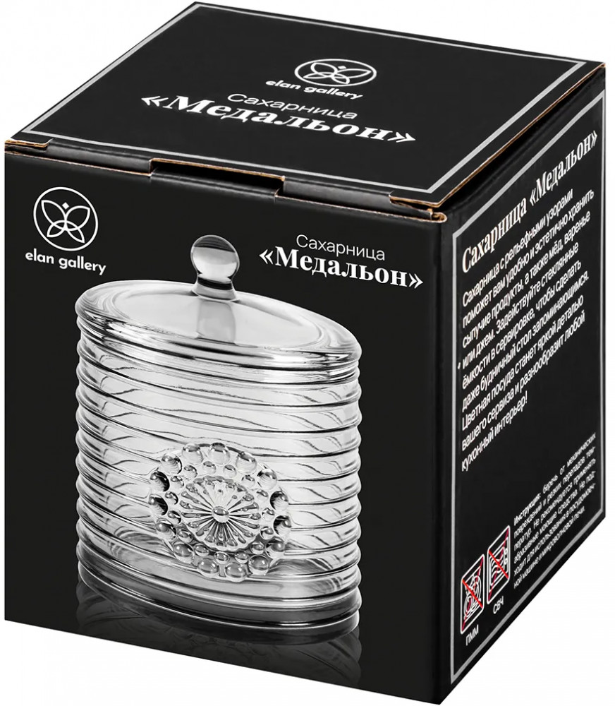 Сахарница Elan Gallery «Медальон» с крышкой выполнена из стекла и украшена декоративным рельефным узором в виде горизонтальных полосок. Стеночку стеклянного изделия украшает выпуклое изображение, напоминающее круглый медальон с декоративными элементами в форме пузырьков. Можно использовать в роли горшочка для мёда. Размер изделия — 8,5×8,5×12 см, объём — 300 мл. Высота без крышки — 8,5 см. Прозрачная баночка с полосатым рельефом подойдёт для хранения мёда, варенья, сахара и соли. Можно использовать её как ёмкость для чая, кофе и других сыпучих продуктов.