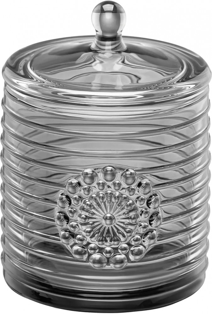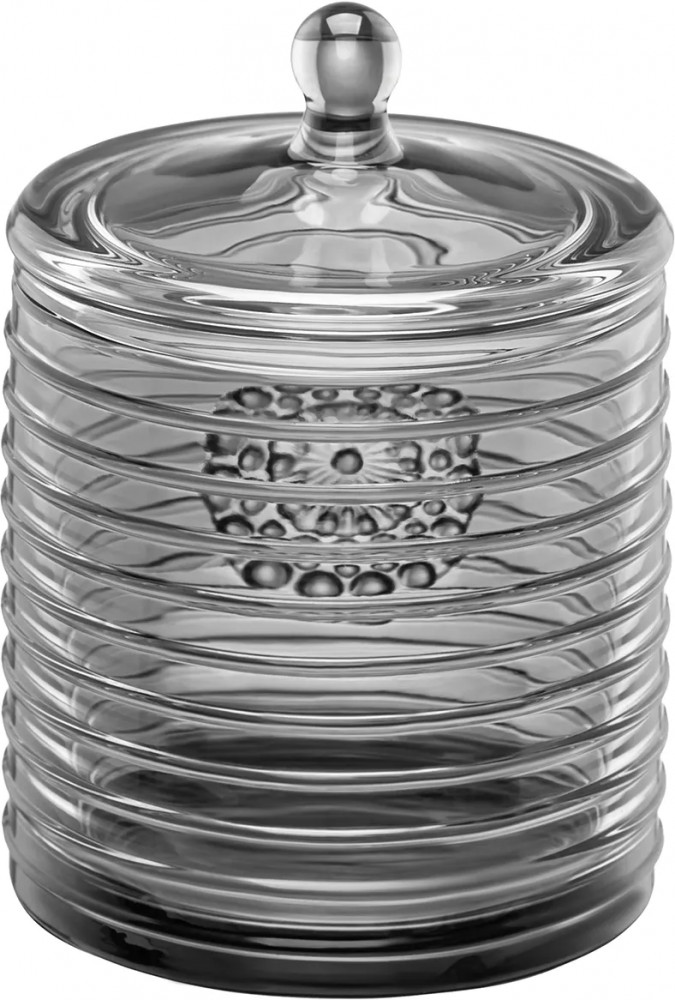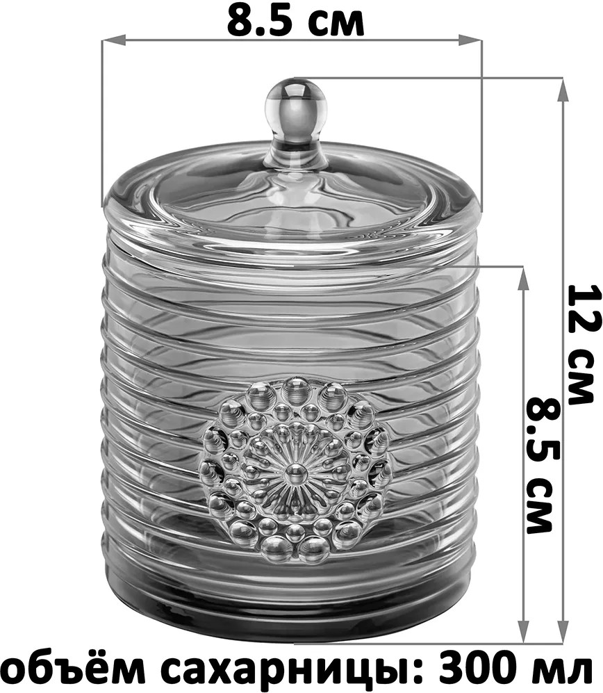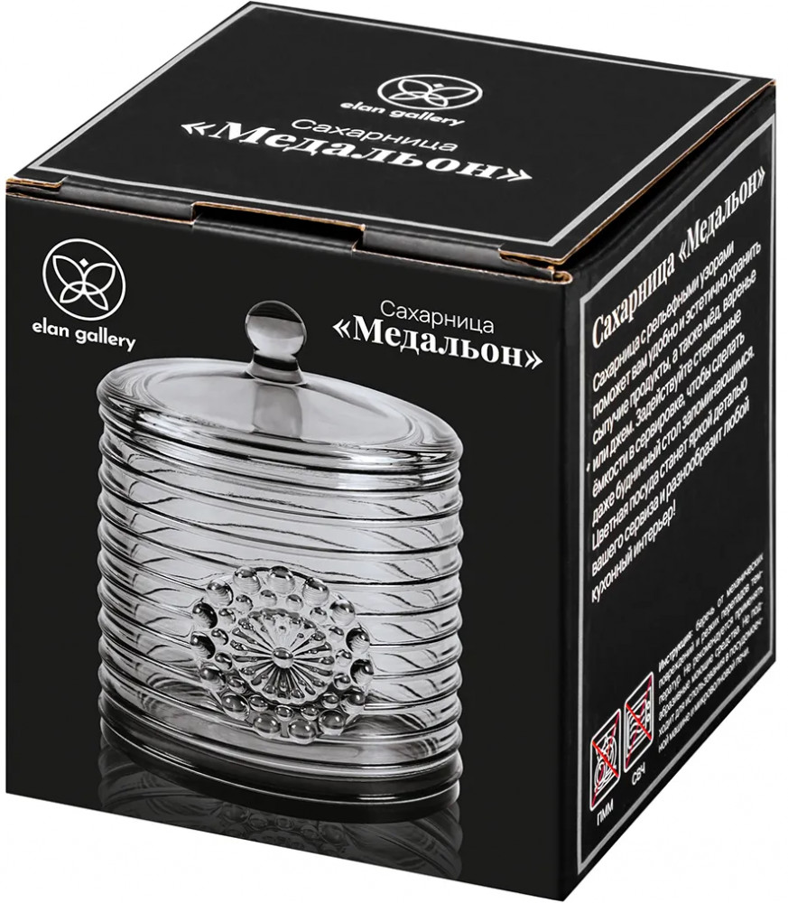 Сахарница Elan Gallery «Медальон» с крышкой выполнена из стекла и украшена декоративным рельефным узором в виде горизонтальных полосок. Стеночку стеклянного изделия украшает выпуклое изображение, напоминающее круглый медальон с декоративными элементами в форме пузырьков. Можно использовать в роли горшочка для мёда. Размер изделия — 8,5×8,5×12 см, объём — 300 мл. Высота без крышки — 8,5 см. Серая баночка с полосатым рельефом подойдёт для хранения мёда, варенья, сахара и соли. Можно использовать её как ёмкость для чая, кофе и других сыпучих продуктов.
