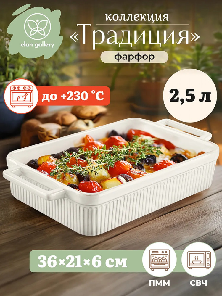 Форма для запекания Elan Gallery «Традиция» объемом 2,5 литра выполнена из фарфора. Размер 36×21×6 см. Внутренний размер 29,6×20,5×5,6 см. Размер без ручек 30,2×21,8×6,2 см, размер дна 29×20,8 см. Фарфоровая ёмкость молочно-белого цвета подходит для выпекания в духовке и подачи готового блюда на стол в той же форме. В ней получится чудесная лазанья или выпечка.