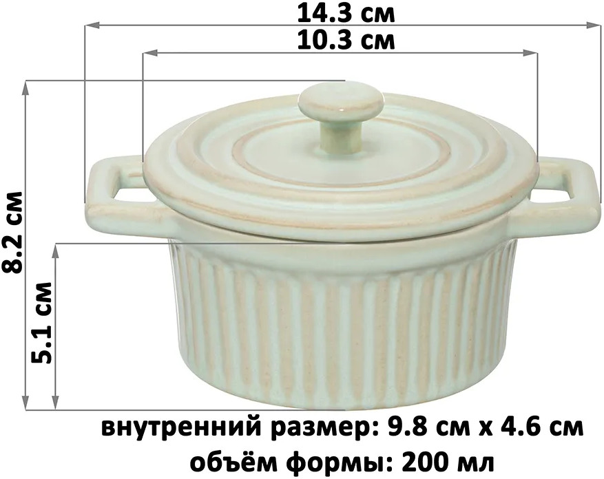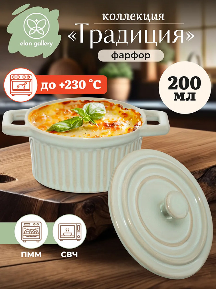 Форма для запекания Elan Gallery «Традиция» объемом 200 мл выполнена из фарфора. Можно использовать как рамекин, жюльенницу, а также для красивой сервировки. Размер 14,3×10,3×8,2 см. Внутренний размер 9,8×4,6 см. Высота без крышки 5,1 см, диаметр крышки 11 см, диаметр дна 9,3 см. Фарфоровая ёмкость мятного цвета подходит для выпекания в духовке и подачи готового блюда на стол в той же форме. В ней получится чудесная лазанья или выпечка.