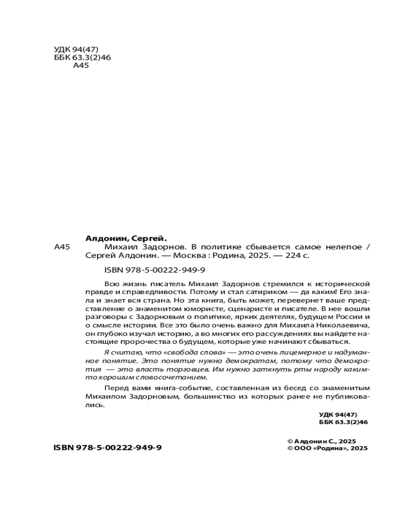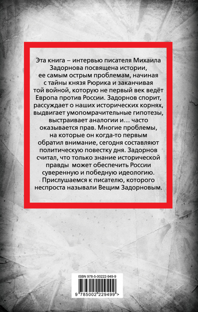 💳 Оплатить за товар можно при получении 🇰🇿 Есть бесплатная доставка по Казахстану от 1 дня 🎁 Копите бонусы с каждой покупки Серия: Кот учёный Всю жизнь писатель Михаил Задорнов стремился к исторической правде и справедливости. Потому и стал сатириком — да каким! Его знала и знает вся страна. Но эта книга, быть может, перевернет ваше представление о знаменитом юмористе, сценаристе и писателе. В нее вошли разговоры с Задорновым о политике, о ярких деятелях, о будущем России и о смысле Истории. Всё это было очень важно для Михаила Николаевича, он глубоко изучал историю, а во многих его рассуждениях вы найдете настоящие пророчества о будущем, которые уже начинают сбываться. |