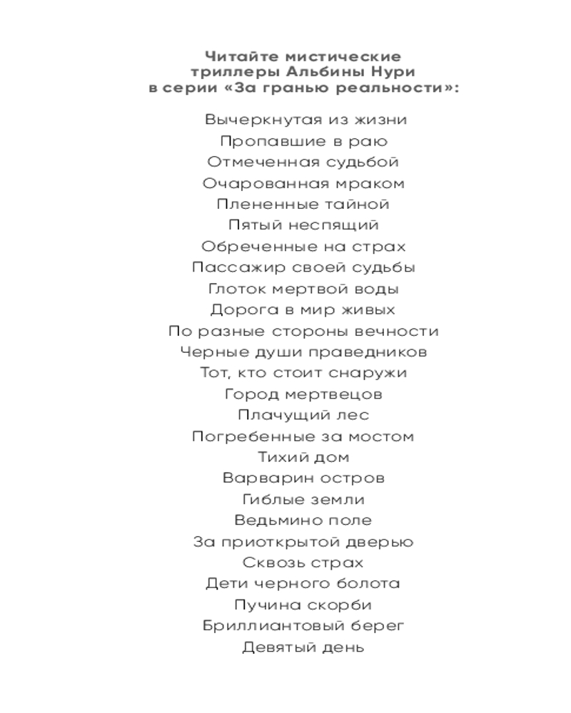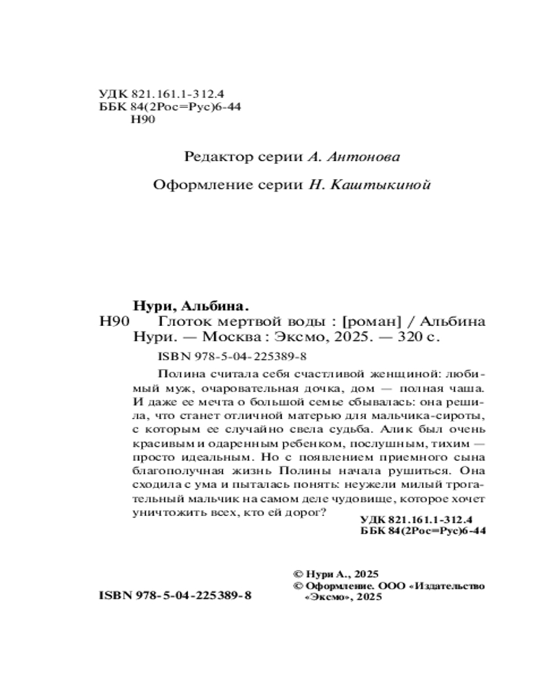 💳 Оплатить за товар можно при получении 🇰🇿 Есть бесплатная доставка по Казахстану от 1 дня 🎁 Копите бонусы с каждой покупки Серия: За гранью реальности. Мистические триллеры Альбины Нури (обложка) Полина считала себя счастливой женщиной: любимый муж, очаровательная дочка, дом — полная чаша. И даже ее мечта о большой семье сбывалась: она решила, что станет отличной матерью для мальчика-сироты, с которым ее случайно свела судьба. Алик был очень красивым и одаренным ребенком, послушным, тихим — просто идеальным. Но с появлением приемного сына благополучная жизнь Полины начала рушиться. Она сходила с ума и пыталась понять: неужели милый трогательный мальчик на самом деле чудовище, которое хочет уничтожить всех, кто ей дорог? |