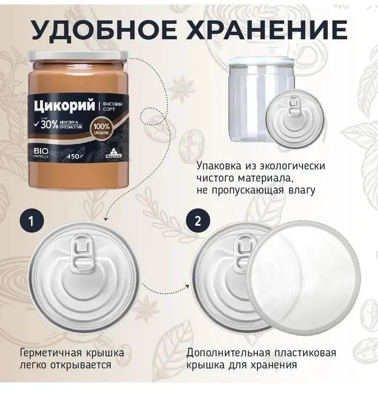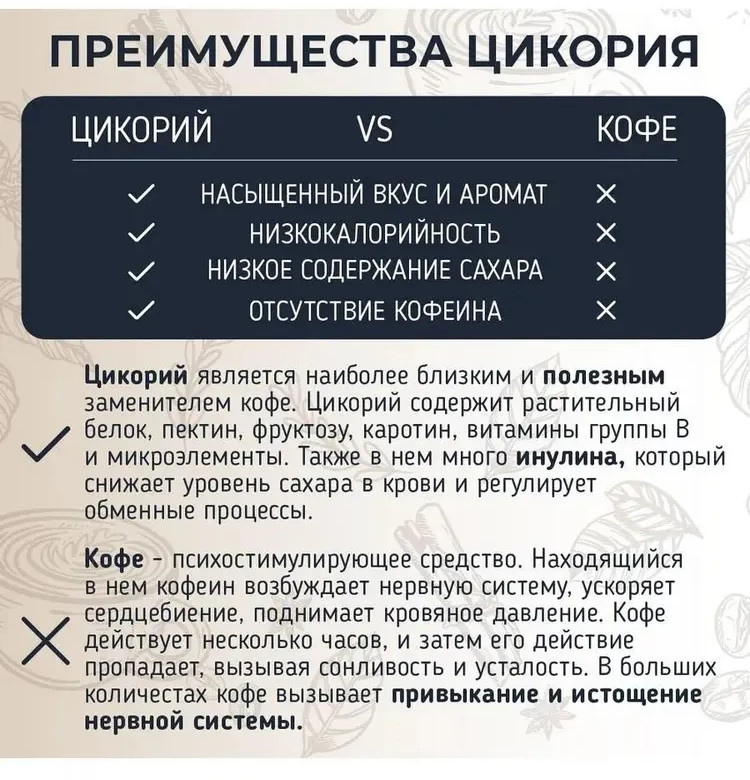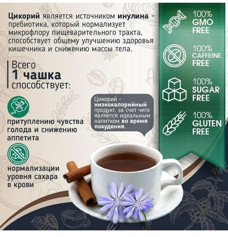 Цикорий известен многим как отличный аналог кофе. Но в отличие от кофейных зерен он не содержит кофеина. Это делает его альтернативой кофе для тех, кто предпочитает безкофеиновые напитки. Заваренный цикорий даёт насыщенный настой с нотами карамельного и орехового вкуса, очень похожего на кофе. Кроме приятного вкуса, он имеет множество полезных свойств для здоровья. Главный плюс цикория — инулин в его составе. Это пребиотик, который помогает создать благоприятную микрофлору в кишечнике, предотвращает дисбактериоз, укрепляет иммунитет. Он богат и другими питательными веществами, такими как кальций, магний, железо и витамины. Цикорий молотый успокаивает нервную систему, снимает стресс, понижает давление, очищает печень, помогает снизить уровень сахара в крови, оказывает ранозаживляющий эффект, стабилизирует работу сердца, сохраняет энергию и тонус организма. Цикорий имеет достаточно низкую калорийность, поэтому его можно отнести к разряду диетических. Он полезен для мужчин, женщин, пожилых людей.