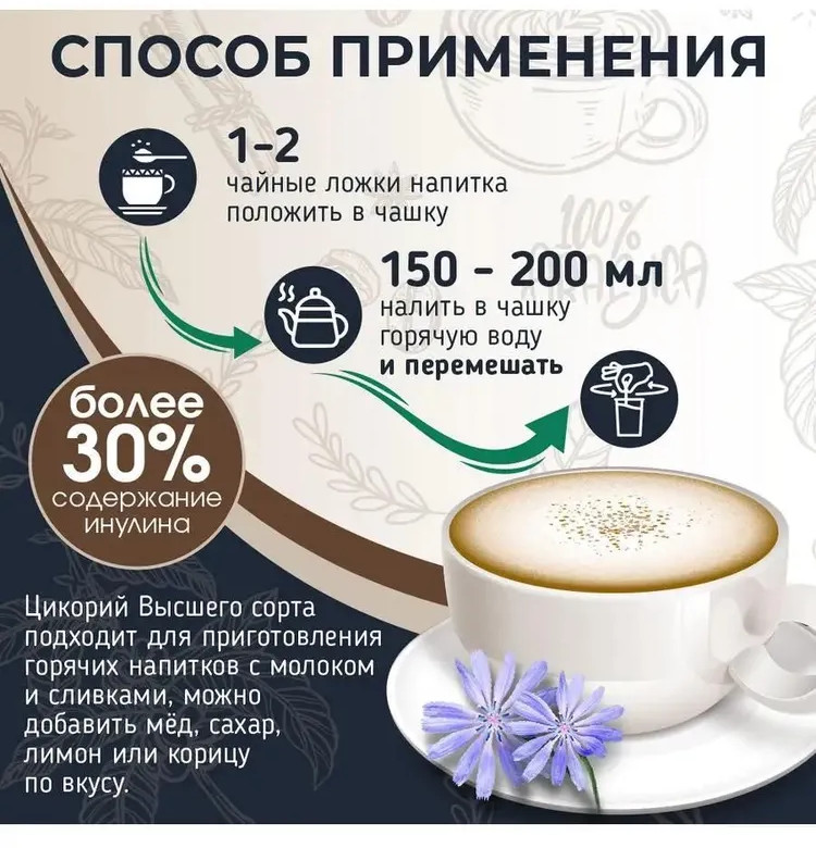 Способ применения: 1-2 чайные ложки цикория растворить в 150 — 200 мл горячей воды, перемешать. Подходит для приготовления горячих напитков с молоком и сливками, можно добавить мёд, сахар, лимон или корицу по вкусу.
