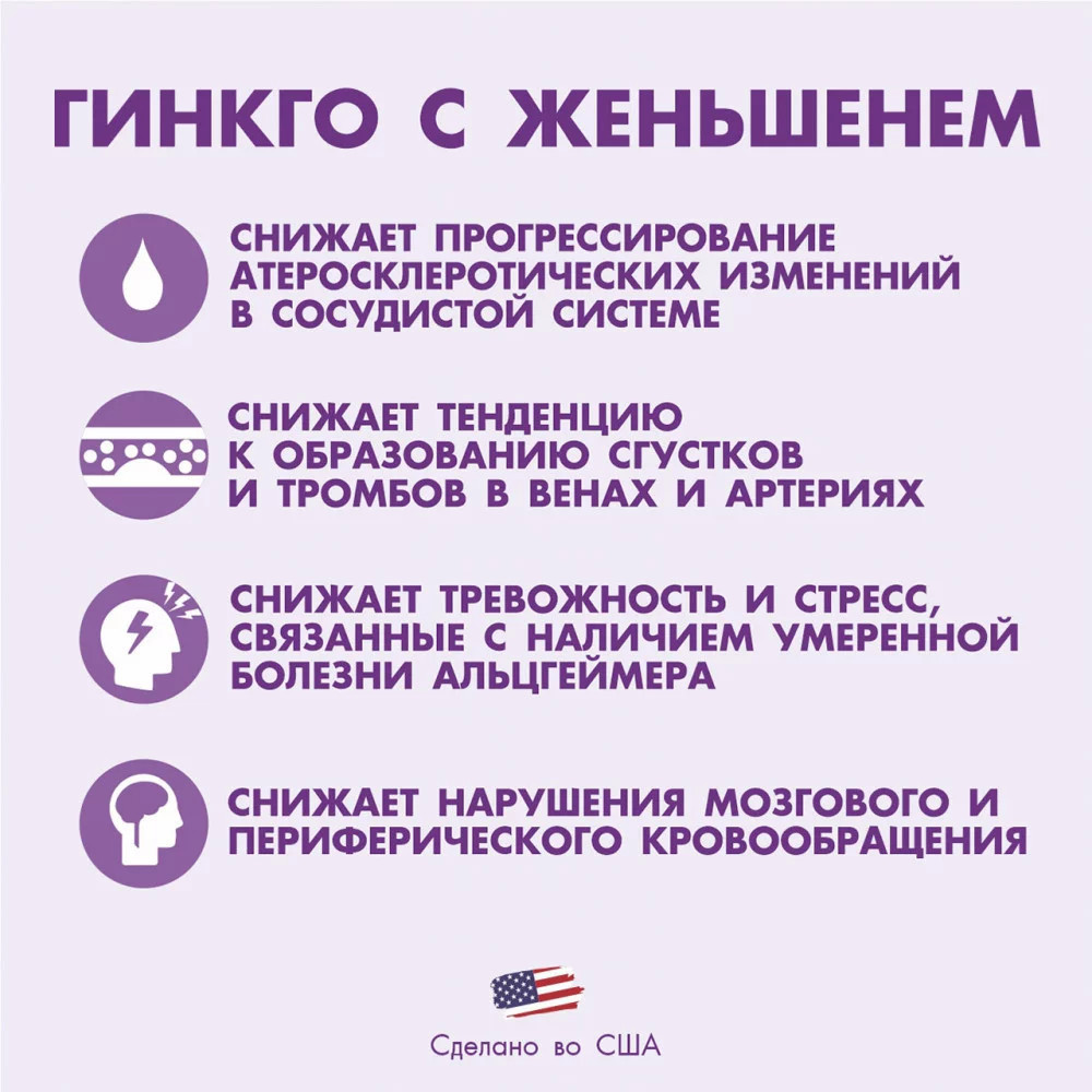 Гинкго с женьшенем – это энергетический тонизатор, который обладает антиоксидантным действием, укрепляет иммунитет и помогает наладить работу центральной нервной системы. Гинкго с женьшенем применяют при неустойчивой хромоте, варикозном расширении вен, высотной болезни, астме, депрессии, слабоумии, при ощущении шума в ушах, головокружении, мигрени, вегето-сосудистой дистонии и нестабильности давления при метеозависимости и в период климактерического периода.