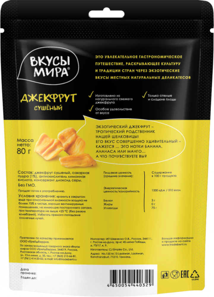 Вкусный, в меру сладкий, можно заменить кондитерские изделия. Кто пробовал настоящие джекфруты, те поймут вкус. Может и вспомнят свое путешествие в экзотические страны. Для разнообразия можно попробовать.