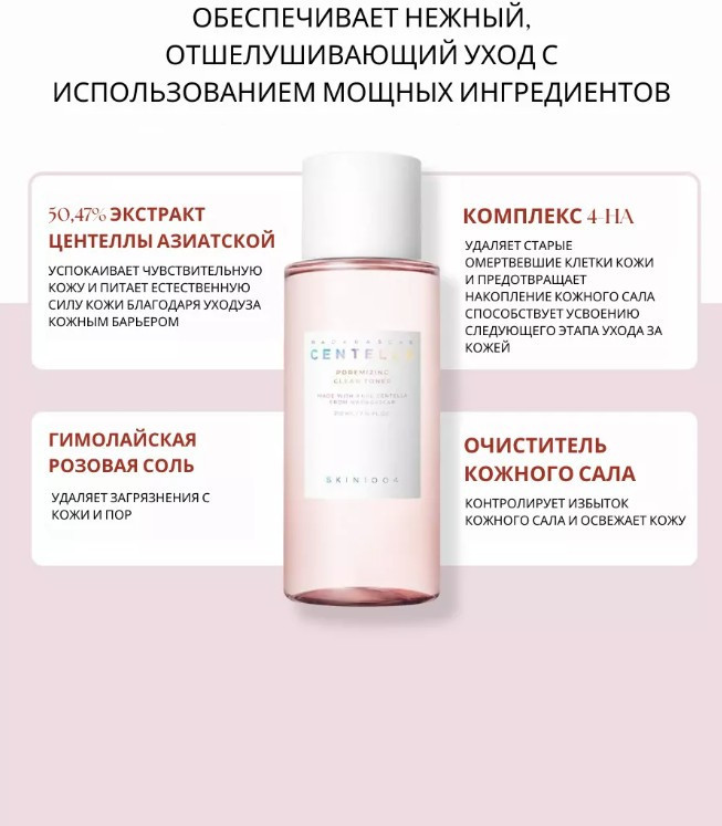 Тоник для сужения пор с центеллой Skin1004 Madagascar Centella Poremizing Clear Toner мягко и деликатно отшелушивает ороговевший слой, удаляет излишки кожного сала, избавляет от чёрных точек и осветляет сальные нити. Восстанавливает оптимальный pH-баланс после умывания, подготавливает поверхность кожи к нанесению последующего ухода. Нормализует работу сальных желёз и отлично матирует. Подходит для комбинированной и жирной кожи.