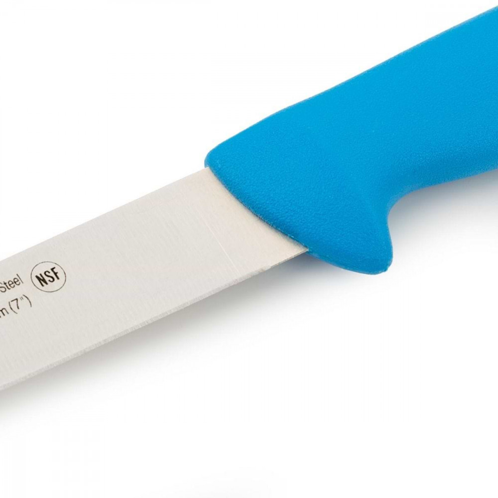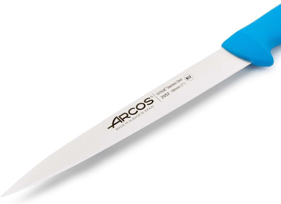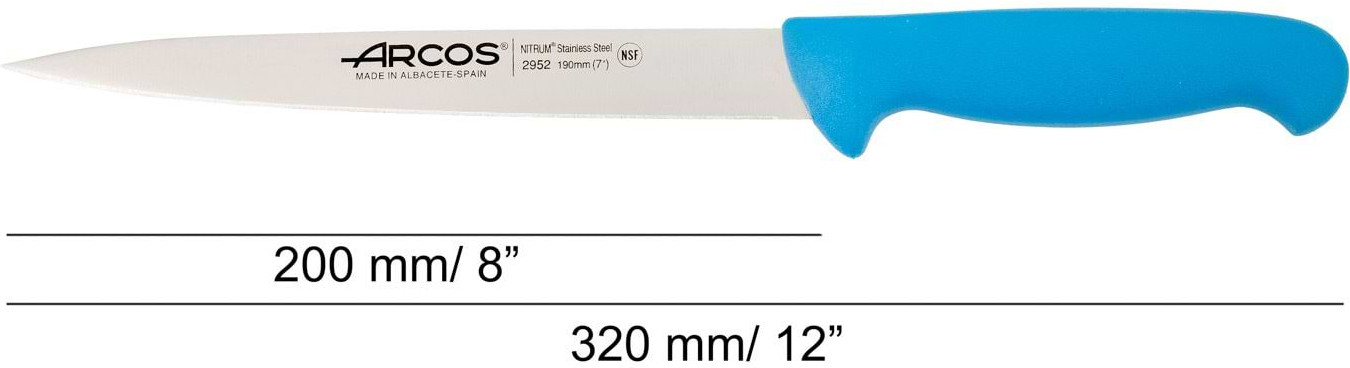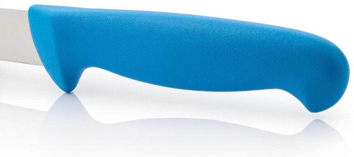 Длинное лезвие, тонкое и гибкое, с гладким краем. Легко и чисто разделывает мясо и рыбу. Лезвие изготовлено из эксклюзивной высококачественной нержавеющей стали с износостойким покрытием Nitrum®. Рукоятка, используемая в этой серии, представляет собой революционную эргономичную рукоятку, изготовленную из инжектированного полипропилена — гигиеничного пластика с высокой ударопрочностью, нескользящей поверхностью и устойчивостью к высоким температурам (120–130 °C). Соединение рукоятки и лезвия прочное благодаря литьевому методу. Цвет рукоятки позволяет идентифицировать нож, различая нарезаемые продукты, что обеспечивает лучший гигиеническо-санитарный контроль для потребителя в соответствии с европейскими нормами.