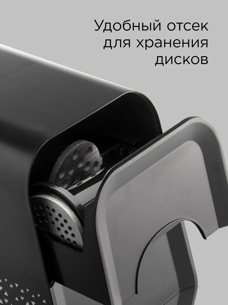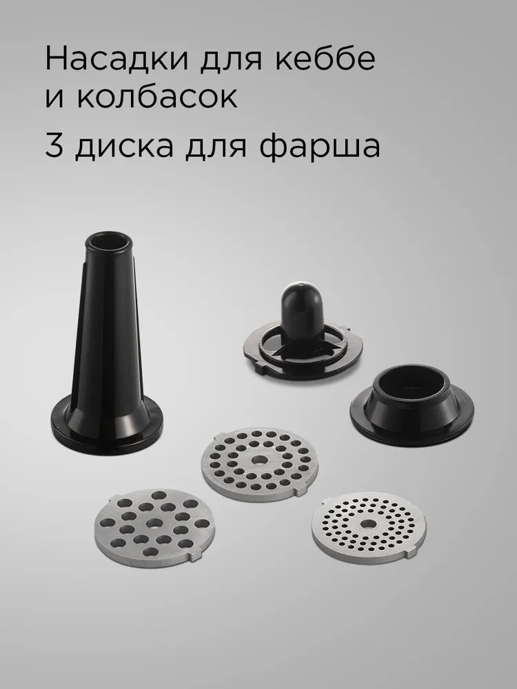 Многофункциональное устройство «3 в 1» с набором сменных насадок для приготовления разных видов фарша, домашних колбасок и восточного блюда кеббе. С помощью перфорированных дисков вы сможете приготовить фарш разной консистенции для самых разнообразных блюд: Чтобы измельчить продукты для мясного соуса болоньезе, тефтелей или котлет, используйте диск для фарша крупного помола. Диск для фарша среднего помола прекрасно подойдет, чтобы подготовить ингредиенты для фаршированных перцев, пельменей, запеканок и начинок для пирогов. С помощью диска для фарша мелкого помола вы быстро и легко переработаете мясо, грибы или овощи для нежных домашних паштетов и колбас. Храните сменные диски в специальном отсеке в корпусе мясорубки, чтобы они были под рукой, как только вам понадобятся.