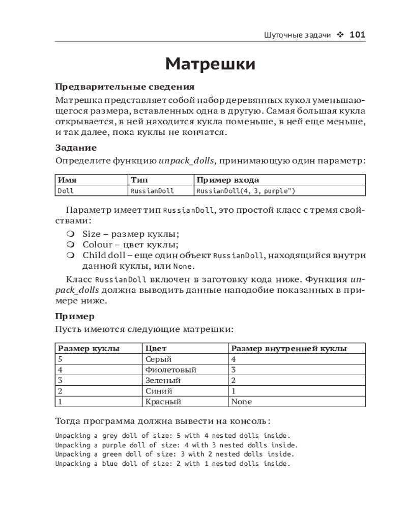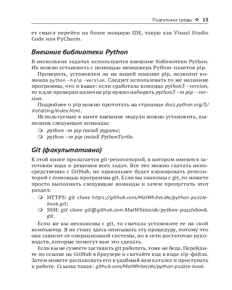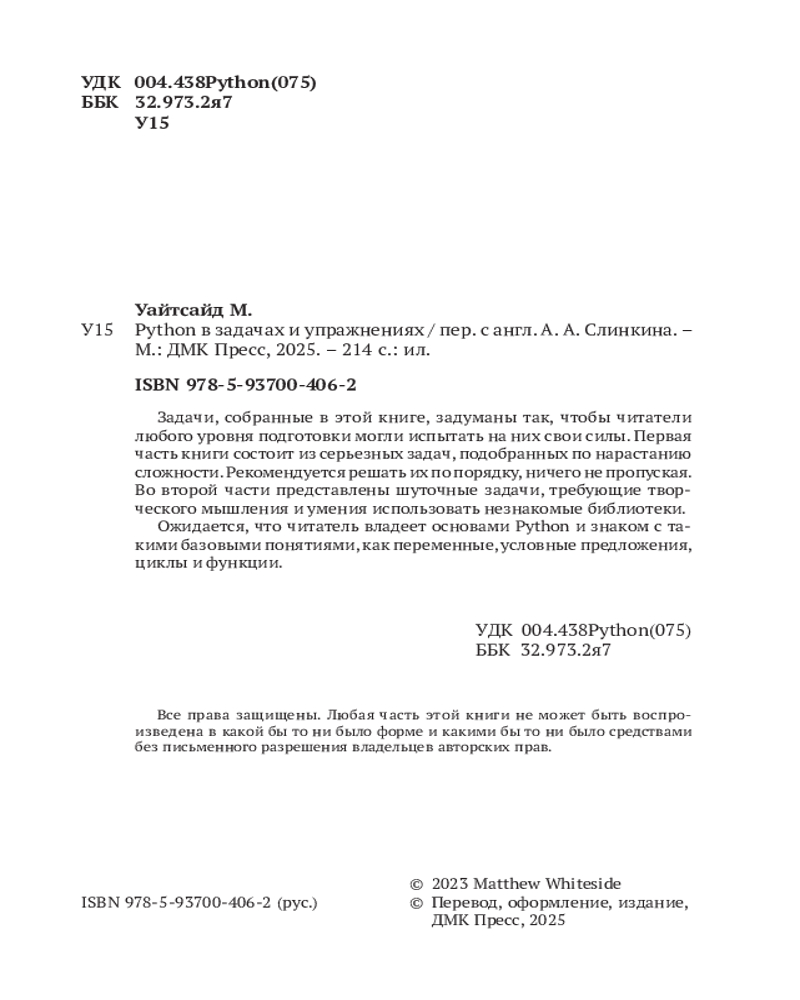 Автор книги Мэттью Уайтсайд — инженер-программист с более чем 10-летним опытом, работающий в финтехе. Он активно участвует в жизни сообщества, общаясь с коллегами в социальных сетях и на форумах. В этой книге Мэттью предлагает читателям проверить свои навыки разработки на Python и решить различные задачи — от простых до весьма сложных и творческих. Книга рассчитана как на начинающих программистов, так и на профессионалов, желающих вывести свои знания на новый уровень. |
