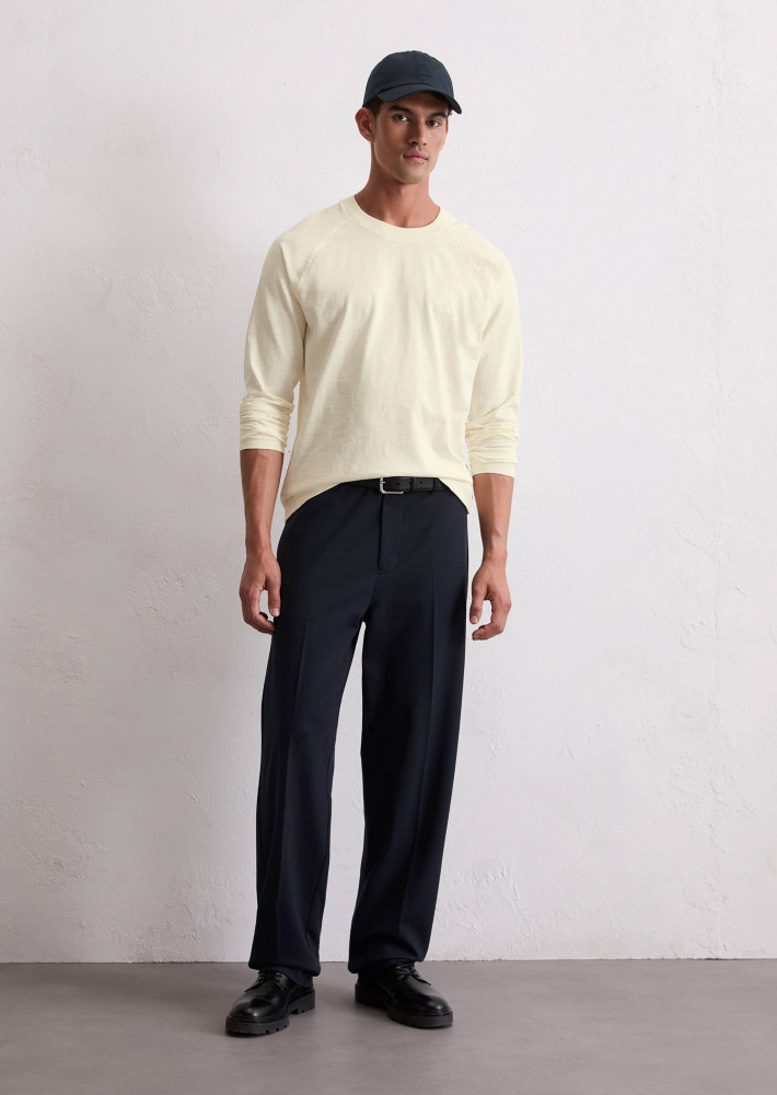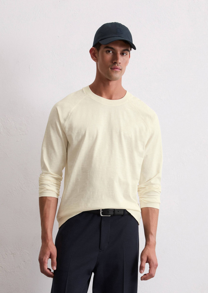 Высококачественный лонгслив из комфортного плотного хлопкового джерси с характерными неровностями в структуре создан согласно критериям кругового дизайна, что значительно упрощает его последующую переработку. Изготовленный из мягкого сертифицированного органического хлопка, он обеспечивает исключительный комфорт при носке. Модель выполнена в мужском прямом крое с эластичным круглым вырезом горловины в мелкий рубчик, длинными рукавами реглан и прямым подолом с отстрочкой. Идеально подходит для повседневной носки, активного отдыха или создания непринужденных офисных образов.