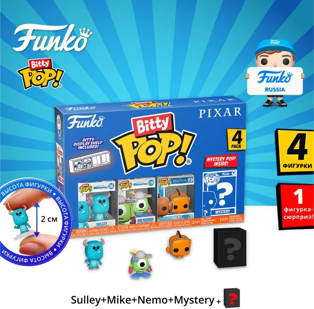 Funko Pop! Набор фигурок «Sulley, Mike, Nemo, Mystery»В данный момент этот товар отсутствует в продаже. Возможно, у нас найдется аналогичный или похожий товар здесь. Серия: Bitty Pop! Фигурка Funko Bitty POP! Pixar Sulley+Mike+Nemo+Mystery (1 of 4) 4PK 75467 по мотивам вселенной «Pixar». Bitty Pop! упакованы в твердые акриловые футляры со съемными нижними крышками. Съемные нижние крышки служат одновременно акриловой основой, к которой приклеены фигурки. Сортируйте и раскладывайте свои Bitty Pop! с помощью прилагаемой витрины. Акриловые витрины можно складывать в штабель и вмещать по четыре фигурки Bitty Pop! в каждый ряд. Высота фигурки — около 2 см. Оригинальный и официально лицензированный продукт. |