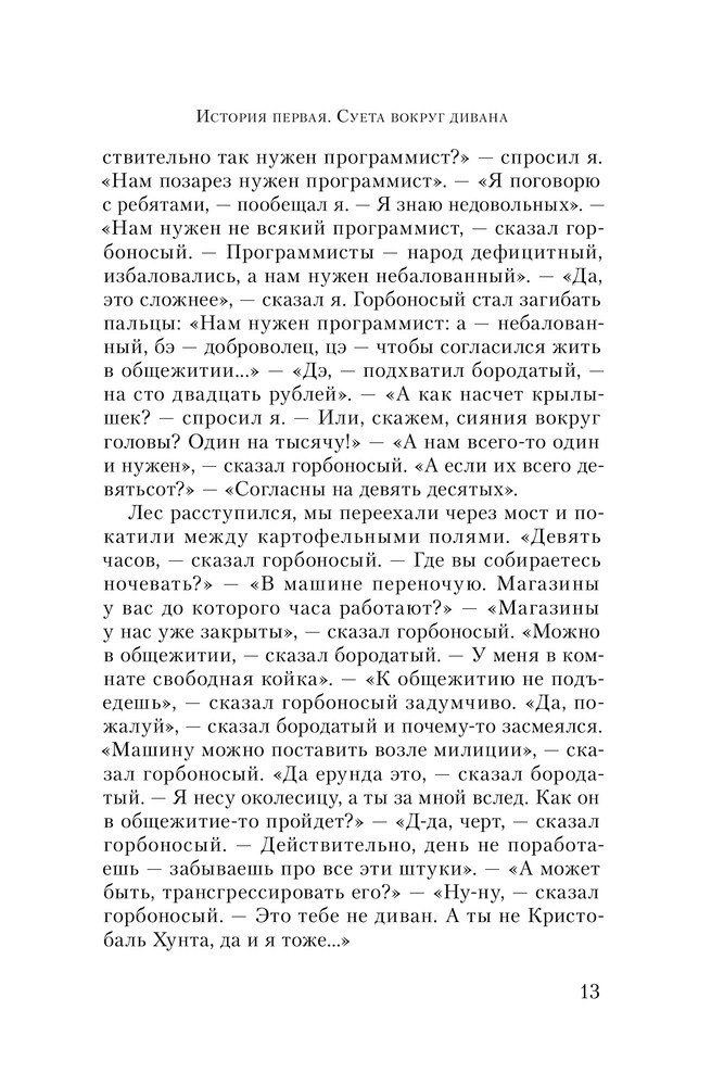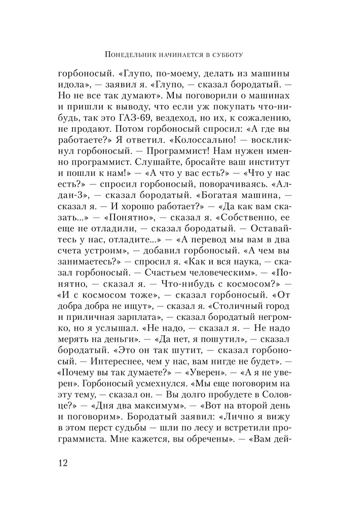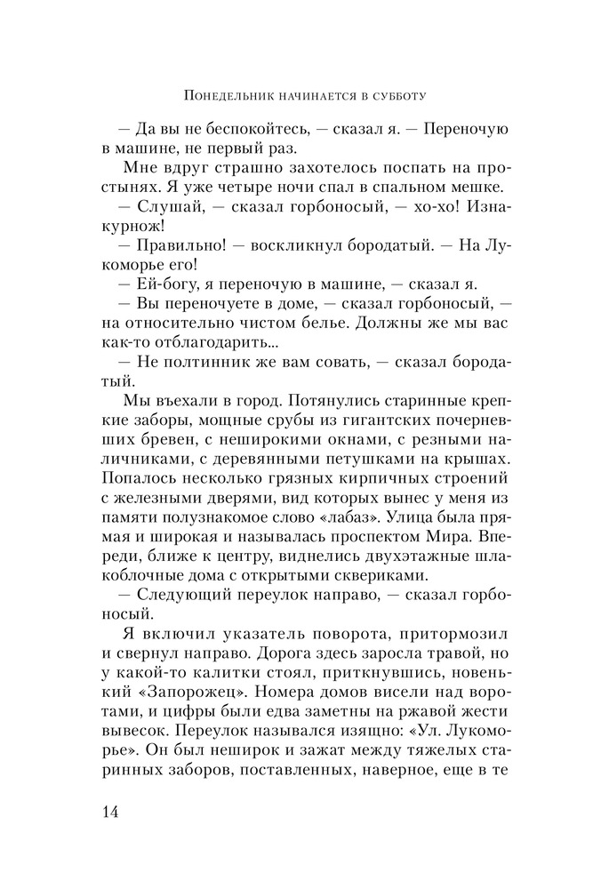 Стругацкие - они вообще такие... сложные, склонные к философии, не всем понятные, но многими любимые. Я к 30-ти годам поняла, что я их безмерно уважаю, но люблю, кажется, только "Понедельник начинается в субботу". Это самое прекрасное, легкое и смешное произведение знаменитых фантастов. Здесь три части, во всех трех главный герой - программист (человек нового времени! Ведь действие происходит в середине шестидесятых) Александр Привалов. Во время отпуска он оказывается в городе Соловце, где знакомится с сотрудниками местного института НИИЧАВО (Научно-Исследовательский институт чародейства и волшебства), окунается в мир "научной магии" и остается в Соловце работать. Но как про все это рассказать, как? Это надо читать! Какой там Кот Ученый, который сказки говорит, но помнит у каждой сказки только начало. И как он мучается от этого. И как рассказать про профессора Выбегалло, который ставит в институте бессмысленные эксперименты по выращиванию кадавров "удовлетворенных желудочно, неудовлетворенных желудочно"? КАКИМ языком все это написано, сколько там иронии, сатиры и юмора... С детства обожаю эту книгу, и очень завидую тем, кто ее еще не читал.