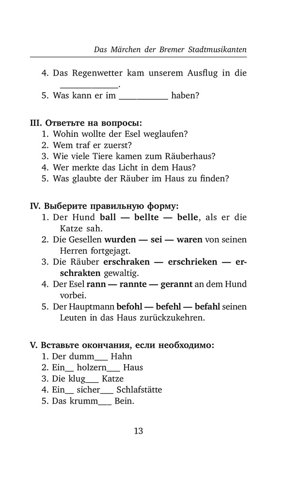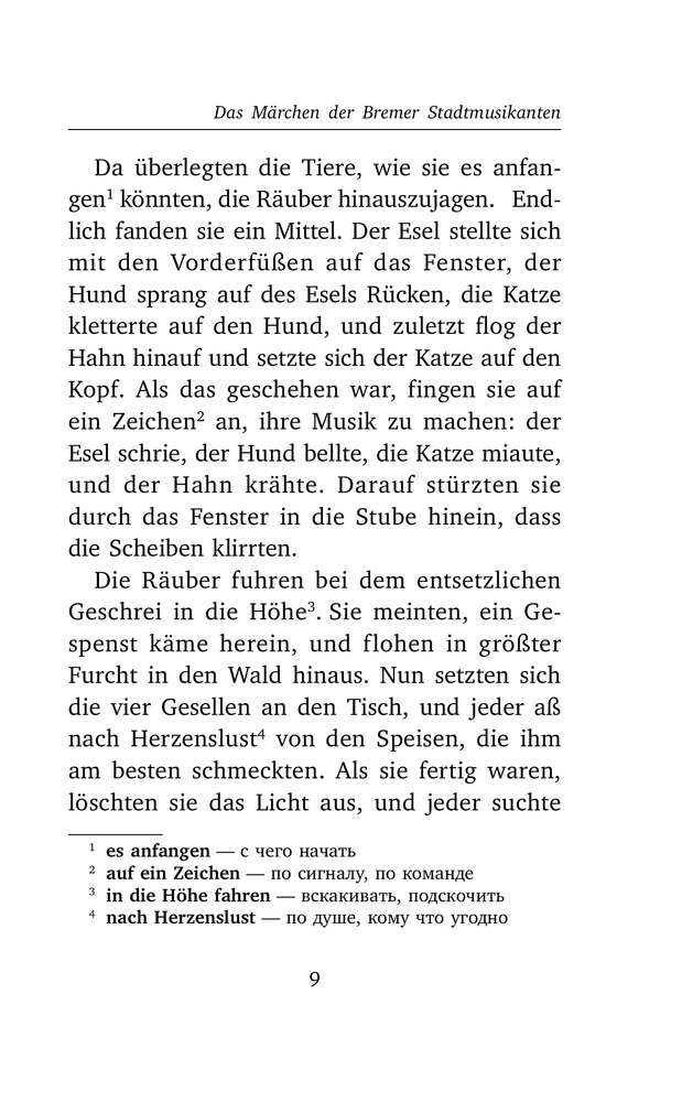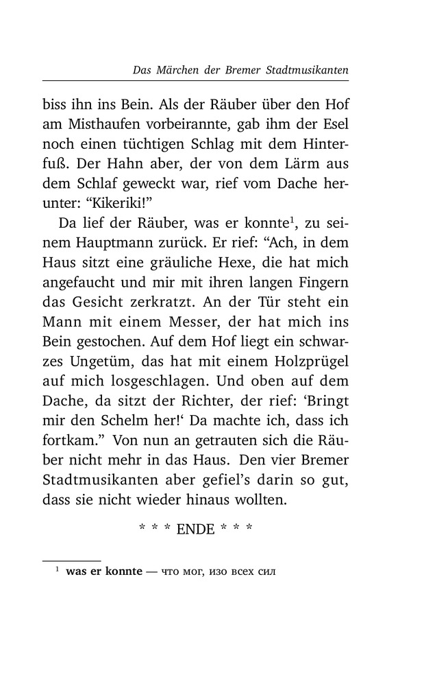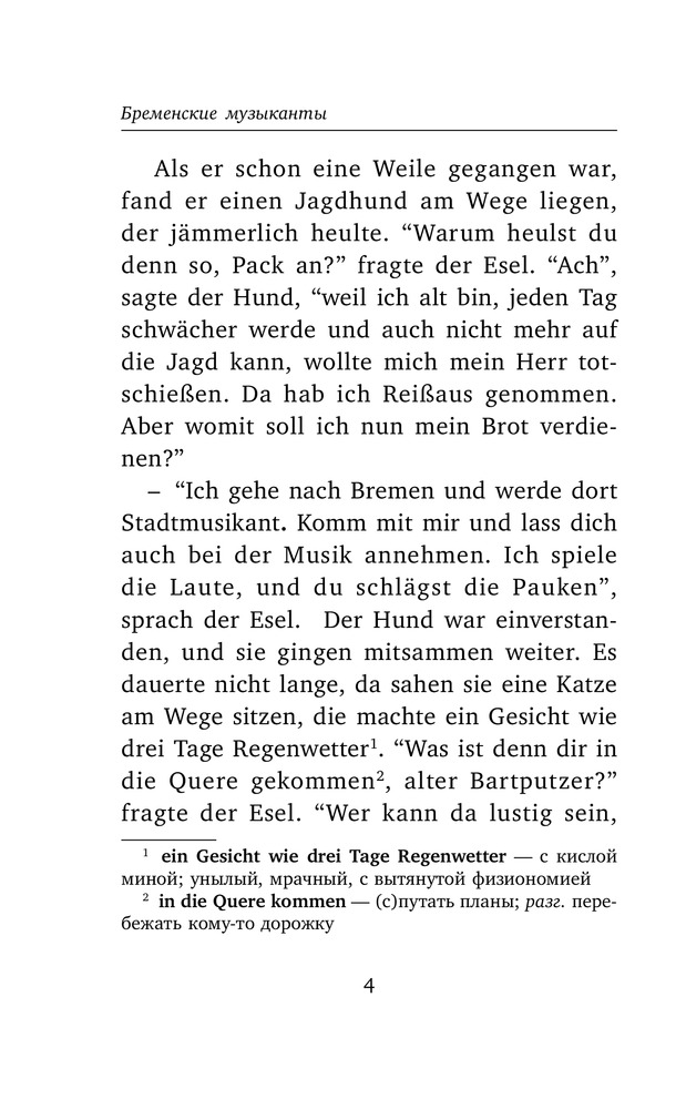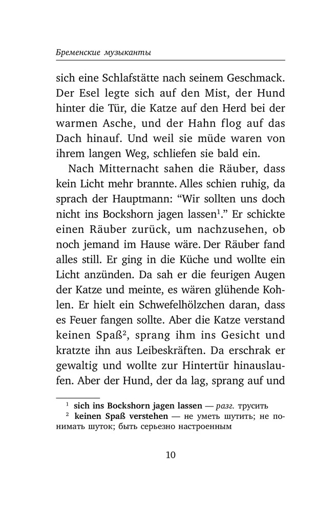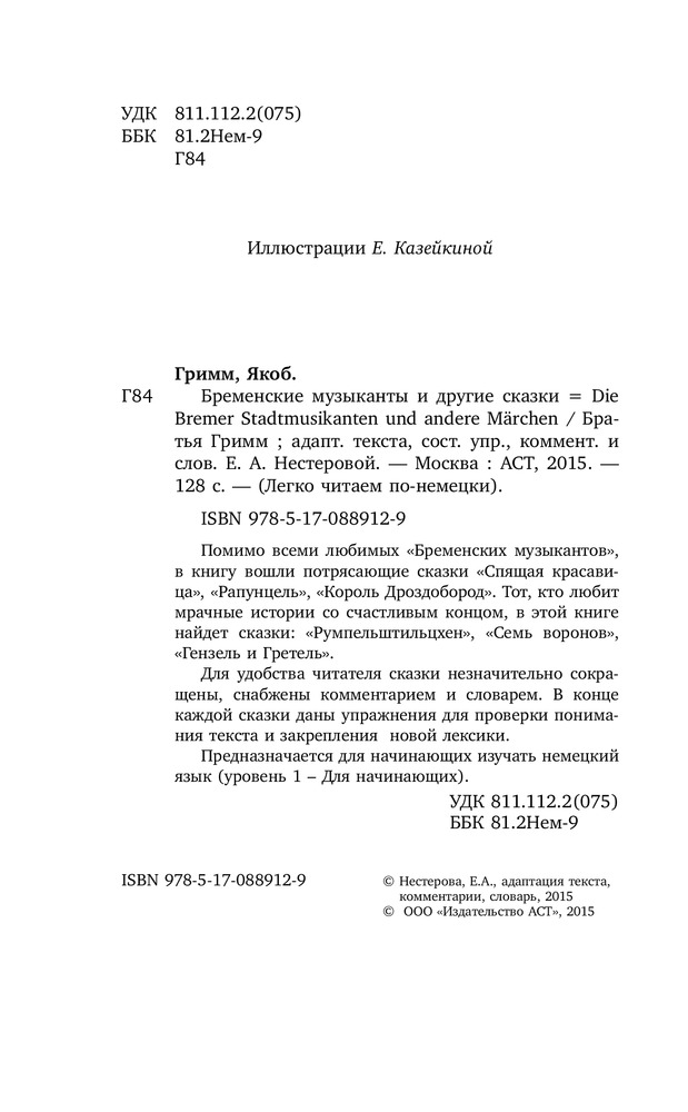 Бременские музыканты и другие сказки. Уровень 1В данный момент этот товар отсутствует в продаже. Возможно, у нас найдется аналогичный или похожий товар здесь. Серия: Легко читаем по-немецки Помимо всеми любимых «Бременских музыкантов», в книгу вошли потрясающие сказки «Спящая Красавица», «Рапунцель», «Король Дроздобород». Тот, кто любит мрачные истории со счастливым концом, в этой книге найдет сказки: «Румпэльштильцхен», «Семь воронов», «Гензель и Гретель». |