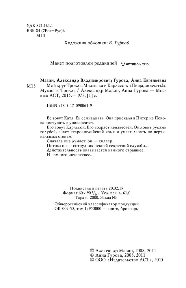 Мой друг ТролльАнна Евгеньевна Гурова, Александр Владимирович Мазин В данный момент этот товар отсутствует в продаже. Возможно, у нас найдется аналогичный или похожий товар здесь. Ее зовут Катя. Ей семнадцать. Она приехала в Питер из Пскова поступать в университет. |