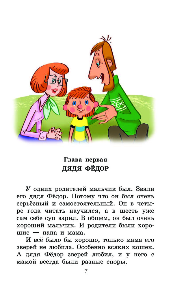Купила дочери - поклоннице историй о Дяде федоре. Книжка очень яркая хорошо иллюстрирована. Много цветных картинок, в то же время достаточно крупный текст. Содержание: 1. Дядя Федор,пес и кот. 2. Зима в Простоквашино. 3. Тетя дяди Федора . 4. Любимая девочка дяди Федора. 5. Дядя Федор идет в школу. 6. Праздники в деревне Простоквашино.