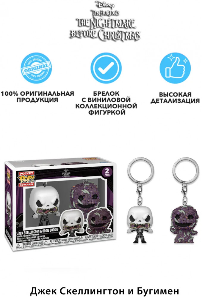 Серия: Disney.TNBC Набор брелоков Funko Pocket POP! Disney TNBC Jack Skellington & Oogie Boogie 2PK 82402 по мотивам мультфильма «Кошмар перед Рождеством». Джек Скеллингтон — вымышленный персонаж, фантастический герой поэмы Тима Бертона и одноимённого кукольного мультфильма по её мотивам. Характер персонажа наделён мощными лидерскими и актёрскими способностями, а также безграничной фантазией. Он ведёт себя как джентельмен (хоть и мёртвый), изящен и терпелив, старается угодить каждому.  |