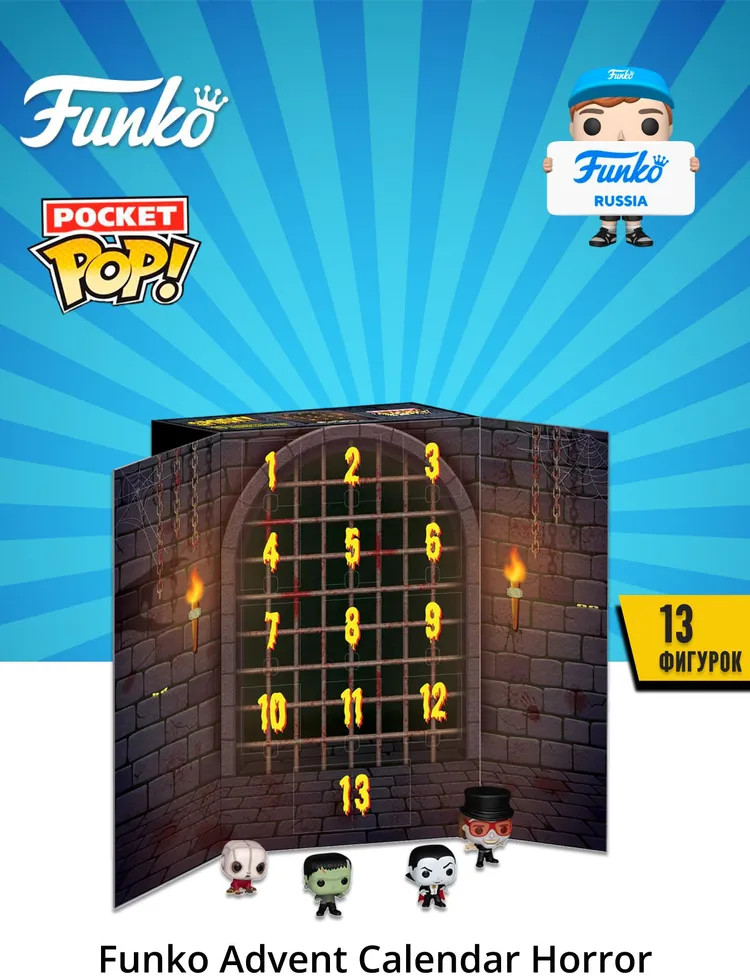 Серия: Advent Calendar Набор подарочный Funko Advent Calendar Horror 13 Day Spooky Countdown NBCU (Pkt POP) 13 фигурок 87799 по мотивам известных фильмов ужасов. Высота фигурок около 5 см. В адвент-календаре спрятаны 13 известных персонажей фильмов ужасов, таких как Монстр Франкенштейна, Дракула и другие. |