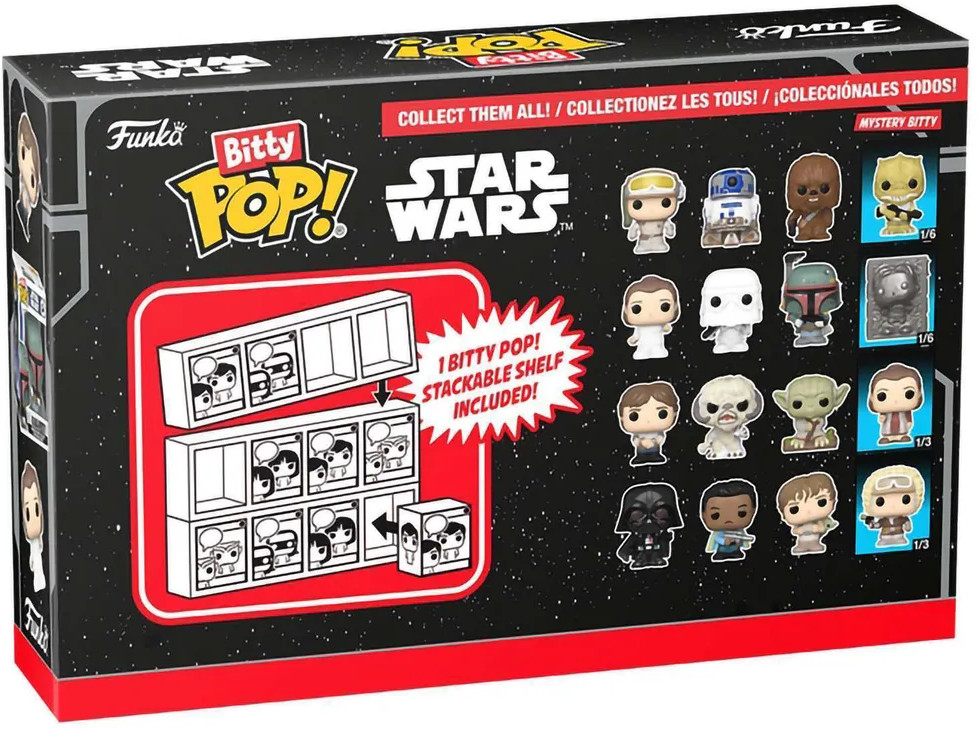 💳 Оплатить за товар можно при получении 🇰🇿 Есть бесплатная доставка по Казахстану от 1 дня 🎁 Копите бонусы с каждой покупки Серия: Bitty Pop! Фигурка Funko Bitty POP! Star Wars S2 Han Solo+Wampa+Dagobah Yoda+Mystery (1 of 4) 4PK 83670 по мотивам вселенной «Звездные войны». Bitty Pop! упакованы в твердые акриловые футляры со съемными нижними крышками. Съемные нижние крышки служат одновременно акриловой основой, к которой приклеены фигурки. Сортируйте и раскладывайте свои Bitty Pop! с помощью прилагаемой витрины. Акриловые витрины можно складывать в штабель и вмещать по четыре фигурки Bitty Pop! в каждый ряд. |