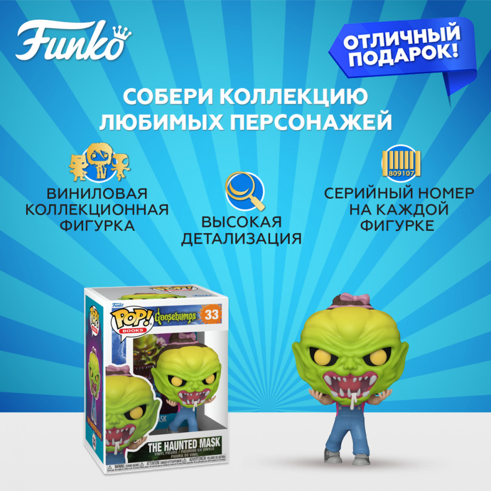 Серия: Goosebumps Фигурка Funko POP! Books Goosebumps The Haunted Mask (33) 80901 по мотивам книги "Маска одержимости«. |