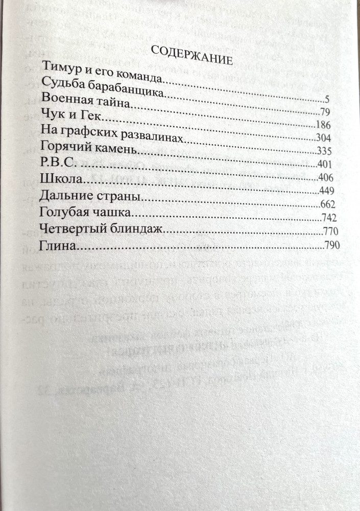 Книга - супер! 12 произведений в одной книге. "Тимур и его команда", "Судьба барабанщика", "Военная тайна", "Чук и Гек", "На графских развалинах", "Горячий камень", "Р.В.С.", "Школа","Дальние страны", "Голубая чашка", "Четвертый блиндаж", "Глина". Шрифт не очень крупный, иллюстраций по всей книги нет. Но есть вставки. Спасибо, Flip.