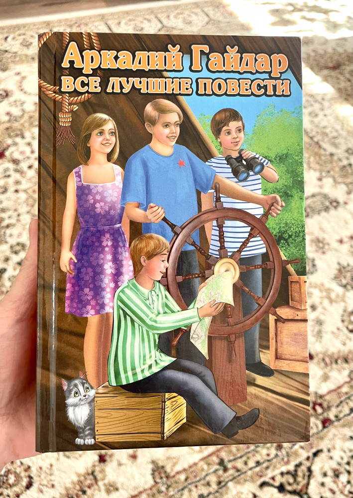 Отличная книга. Люблю Гайдара ещё со школы, когда читали «Тимур и его команда». Книга толстая, но легкая, за счет тонких, серых листов. Переплет качественный. Шрифт достаточно крупный. Читать легко. Картинки только посередине книги, как вставки.
