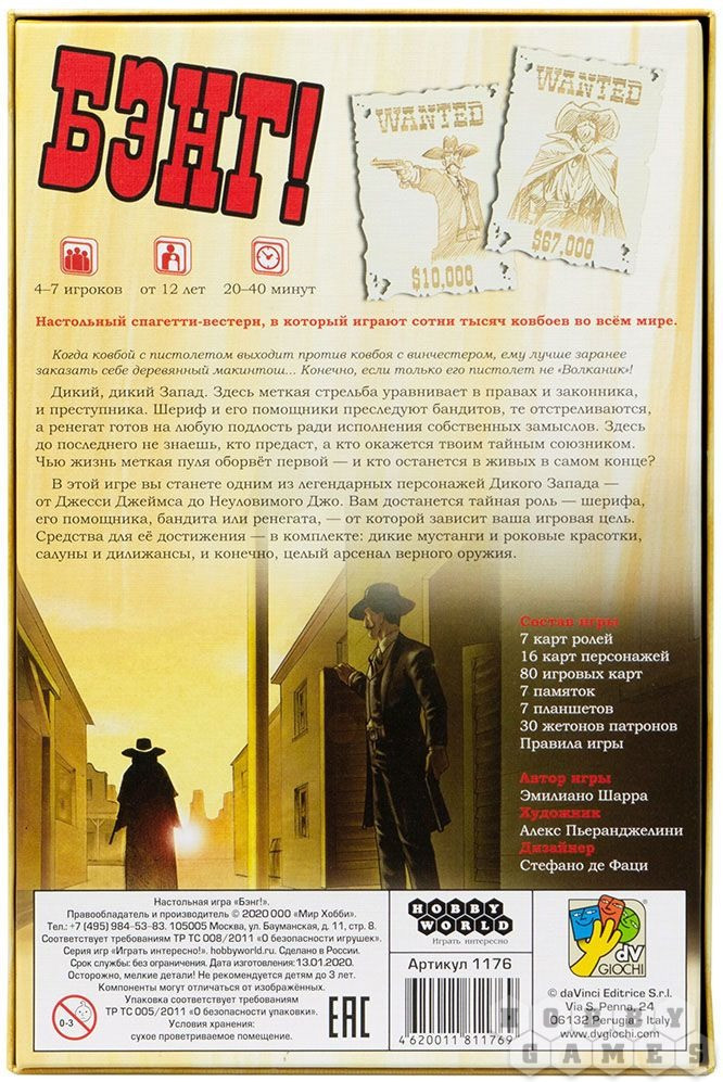 Всё это, а также несложная, но захватывающая боевая система, гарантирует, что Вы получите несравненное удовольствие от настольной игры «Бэнг»! |
