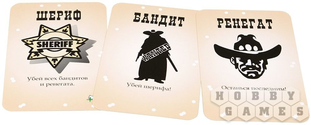 Интригу и напряжение создаёт то, что роль игрока держится в секрете, за исключением роли Шерифа — уж его-то все знают, местная власть Закона как-никак. Помимо карт ролей, игроки также получают карту персонажа — она держится в открытую и определяет Ваши специальные возможности — таких карт больше 10, поэтому каждая игра будет очень сильно отличаться от предыдущей.
