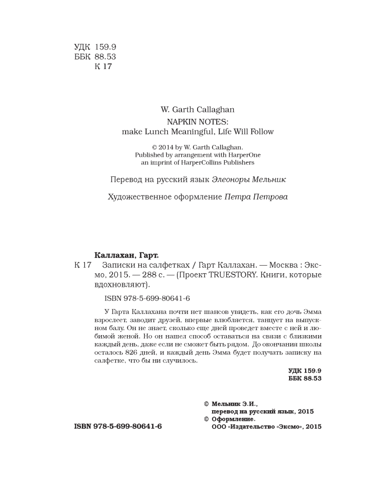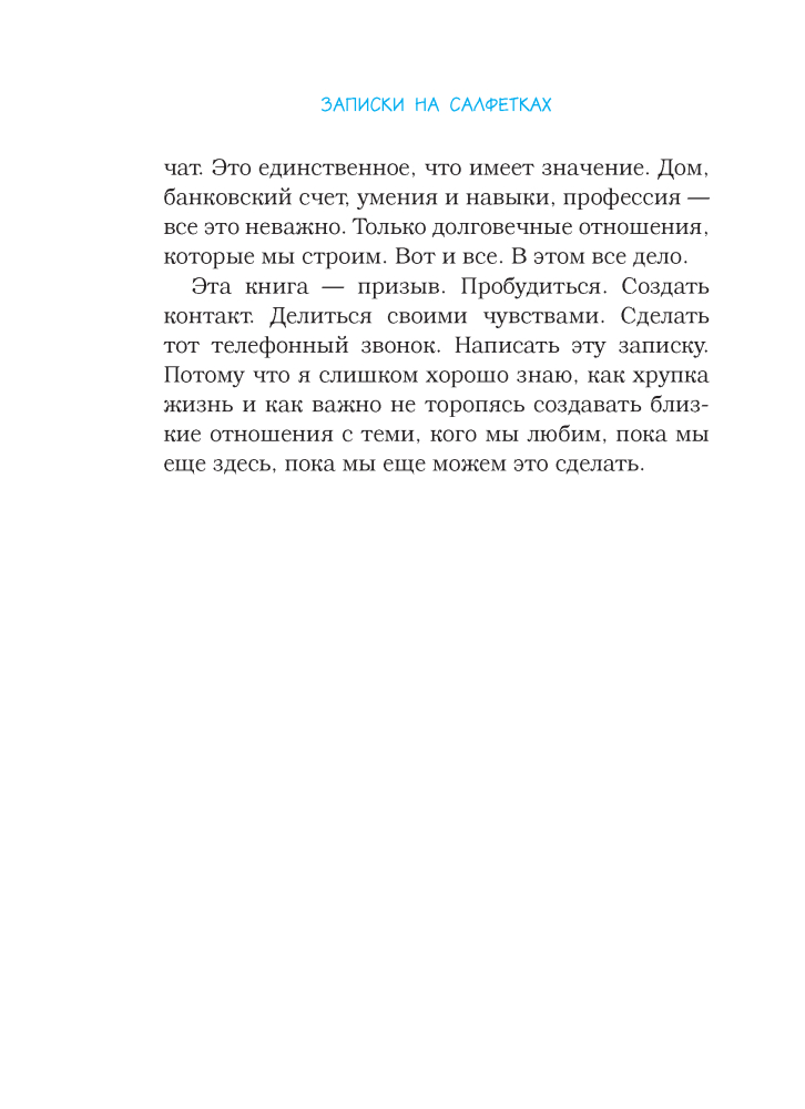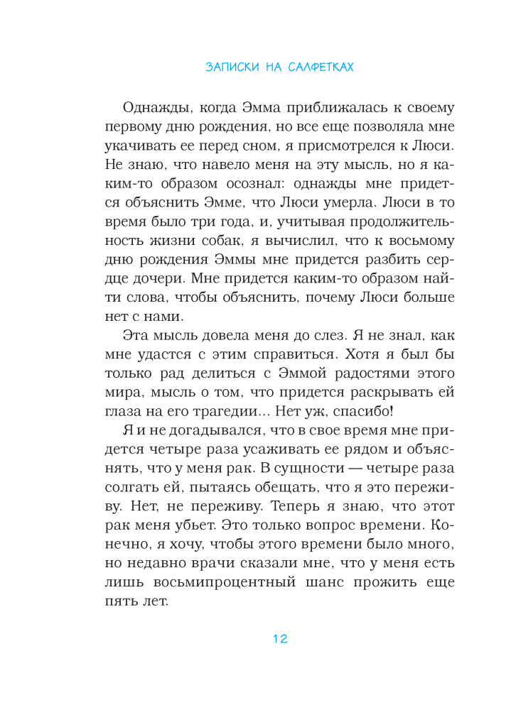 Записки на салфеткахВ данный момент этот товар отсутствует в продаже. Возможно, у нас найдется аналогичный или похожий товар здесь. Серия: Проект TRUE STORY. Книги, которые вдохновляют У Гарта Каллахана почти нет шансов увидеть, как его дочь Эмма взрослеет, заводит друзей, впервые влюбляется, танцует на выпускном балу. Он не знает, сколько еще дней проведет вместе с ней и любимой женой. Но он нашел способ оставаться на связи с близкими каждый день, даже если не сможет быть рядом. До окончания школы осталось 826 дней, и каждый день Эмма будет получать записку на салфетке, чтобы ни случилось. |