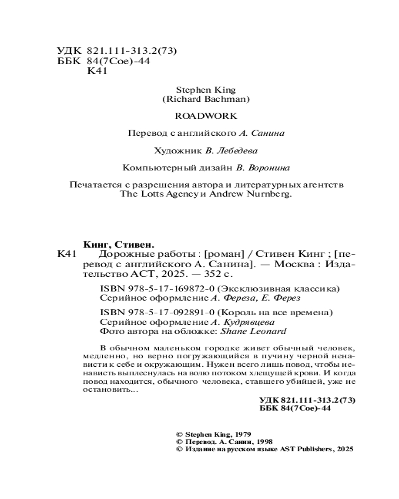 💳 Оплатить за товар можно при получении 🇰🇿 Есть бесплатная доставка по Казахстану от 1 дня 🎁 Копите бонусы с каждой покупки Серия: Эксклюзивная классика В обычном маленьком городке живет обычный человек, медленно, но верно погружающийся в пучину черной ненависти к себе и окружающим. Нужен всего лишь повод, чтобы ненависть выплеснулась на волю потоком хлещущей крови. И когда повод находится, обычного человека, ставшего убийцей, уже не остановить... |