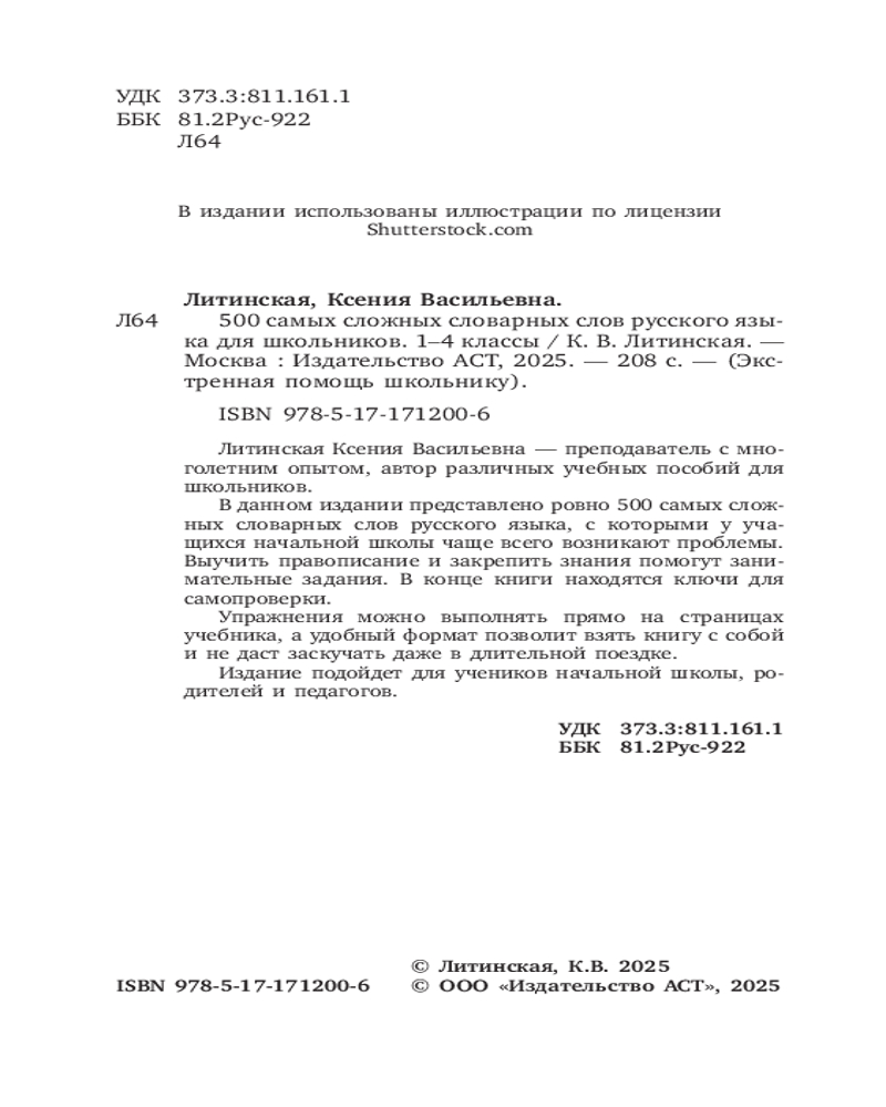 💳 Оплатить за товар можно при получении 🇰🇿 Есть бесплатная доставка по Казахстану от 1 дня 🎁 Копите бонусы с каждой покупки Серия: Экстренная помощь школьнику Литинская Ксения Васильевна — преподаватель с многолетним опытом, автор различных учебных пособий для школьников. В данном издании представлено ровно 500 самых сложных словарных слов русского языка, с которыми у учащихся начальной школы чаще всего возникают проблемы. Выучить правописание и закрепить знания помогут занимательные задания. В конце книги находятся ключи для самопроверки. Упражнения можно выполнять прямо на страницах учебника, а удобный формат позволит взять книгу с собой и не даст заскучать даже в длительной поездке. Издание подойдет для учеников начальной школы, родителей и педагогов. |