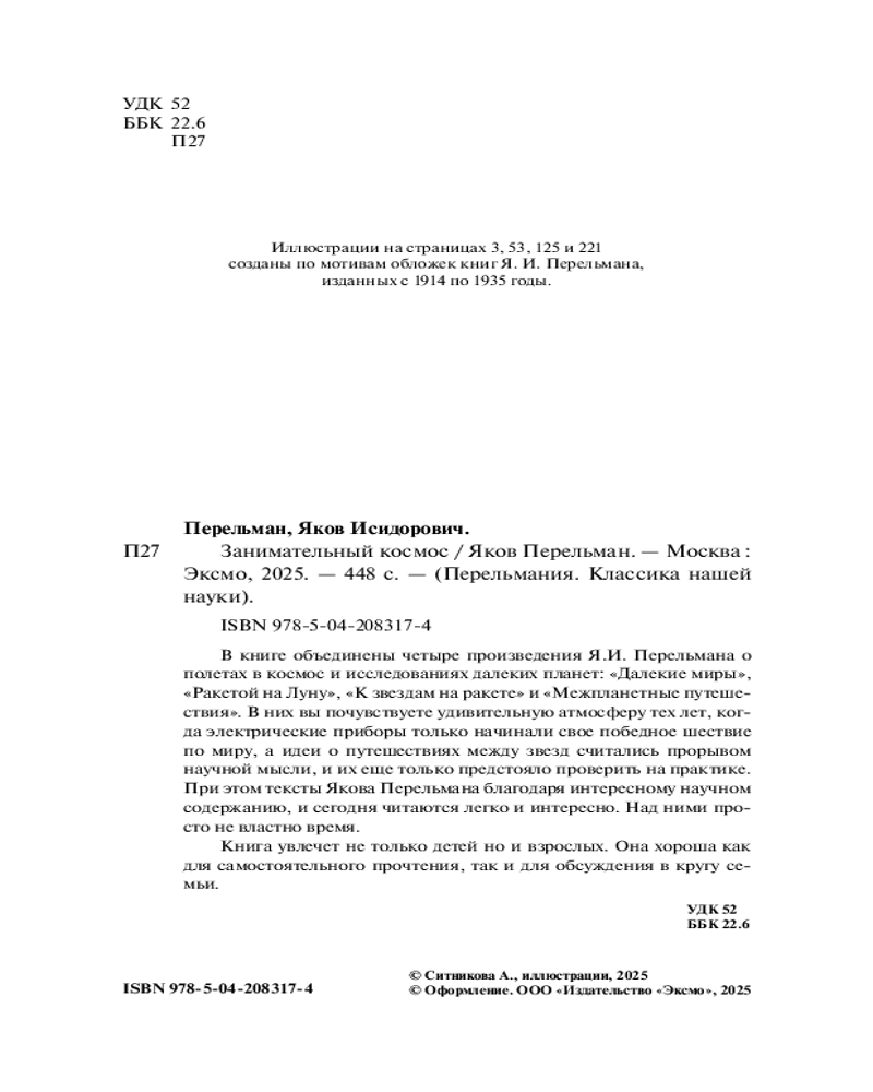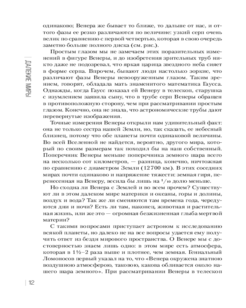 Серия: Перельмания. Классика нашей науки В книге объединены четыре произведения Я.И. Перельмана о полетах в космос и исследованиях далеких планет: «Далекие миры», «Ракетой на Луну», «К звездам на ракете» и «Межпланетные путешествия». В них вы почувствуете удивительную атмосферу тех лет, когда электрические приборы только начинали свое победное шествие по миру, а идеи о путешествиях между звезд считались прорывом научной мысли, и их еще только предстояло проверить на практике. При этом тексты Якова Перельмана благодаря интересному научном содержанию, и сегодня читаются легко и интересно. Над ними просто не властно время. Книга увлечет не только детей но и взрослых. Она хороша как для самостоятельного прочтения, так и для обсуждения в кругу семьи. |