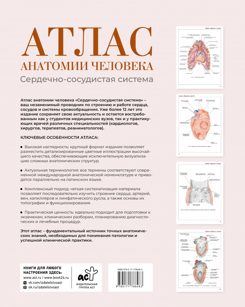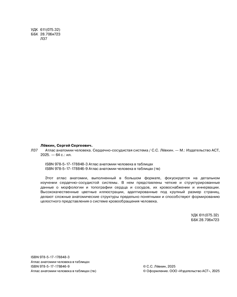 Серия: Атлас анатомии человека в таблицах Атлас анатомии человека «Сердечно-сосудистая система» С.С. Лёвкина — ваш незаменимый проводник по строению и работе сердца, сосудов и системы кровообращения. Уже более 12 лет это издание сохраняет свою актуальность и остается востребованным как у студентов медицинских вузов, так и у практикующих врачей различных специальностей (кардиологов, хирургов, терапевтов, реаниматологов). |