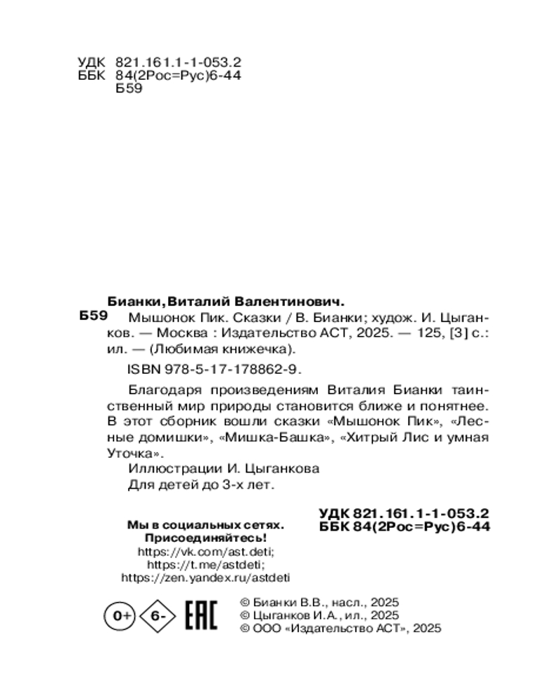 Серия: Любимая книжечка Благодаря произведениям Виталия Бианки таинственный мир природы становится ближе и понятнее. В этот сборник вошли сказки «Мышонок Пик», «Лесные домишки», «Мишка-Башка», «Хитрый Лис и умная Уточка». Иллюстрации И. Цыганкова. Для детей до 3-х лет. |