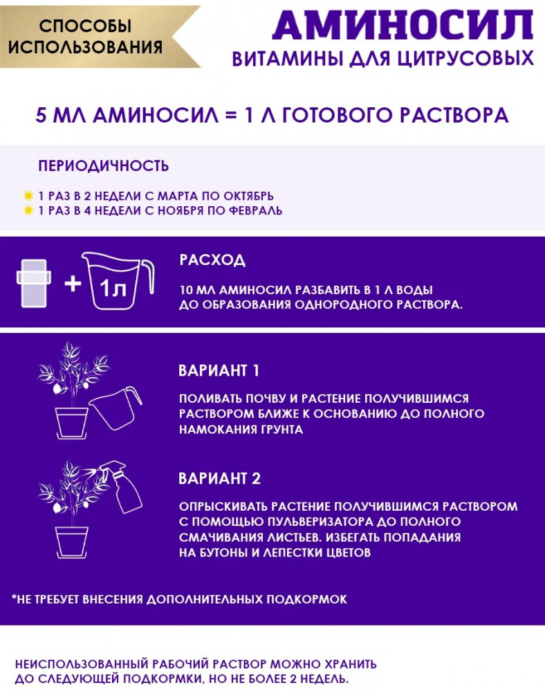 Аминосил — единственный в России комплекс для растений в хелатной (Легкоусвояемой) форме, в составе имеет все необходимые макро и микроэлементы. Витамины для цитрусовых представляют собой идеальное средство для удобрения и полноценного ухода. Уникальная формула Аминосил насыщает растения, их субстрат и почву всеми необходимыми витаминами, обеспечивая комплексное питание. |