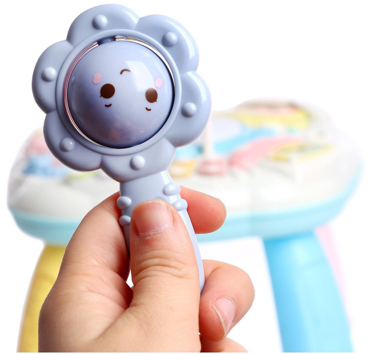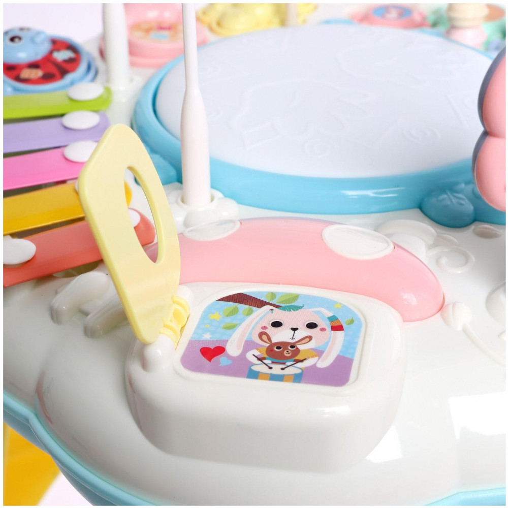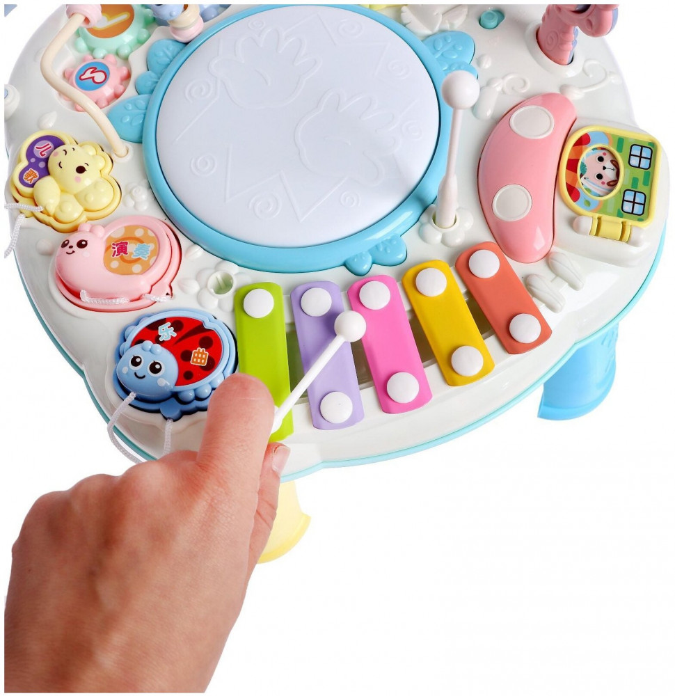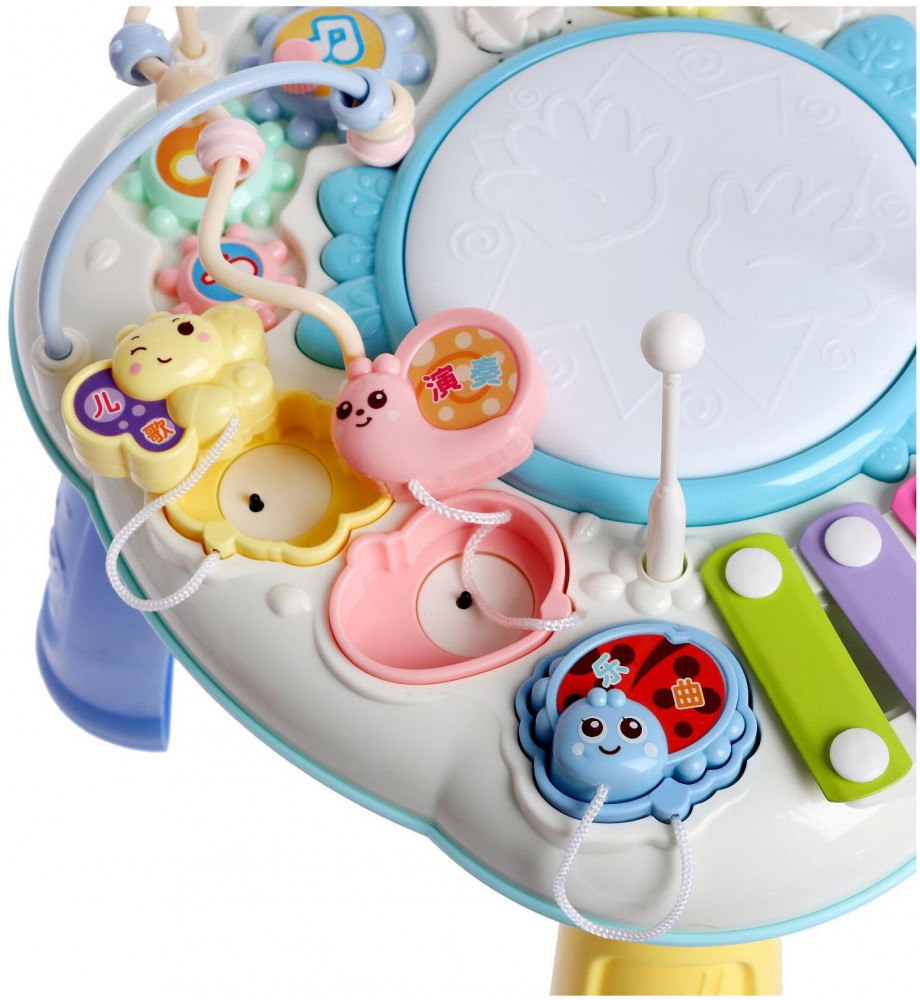 В развивающий столик встроен ксилофон — малыш может играть, нажимая на цветные клавиши. Этот элемент развивает не только музыкальные предпочтения ребенка, но и помогает укреплять моторику и координацию рук. Игра на ксилофоне также способствует улучшению слухового восприятия и различению нот. Взаимодействие с игровым столиком помогает развивать мелкую моторику и координацию движений. Он учится нажимать на кнопки, играть на ксилофоне и взаимодействовать с различными элементами, что способствует укреплению ручек и пальчиков.