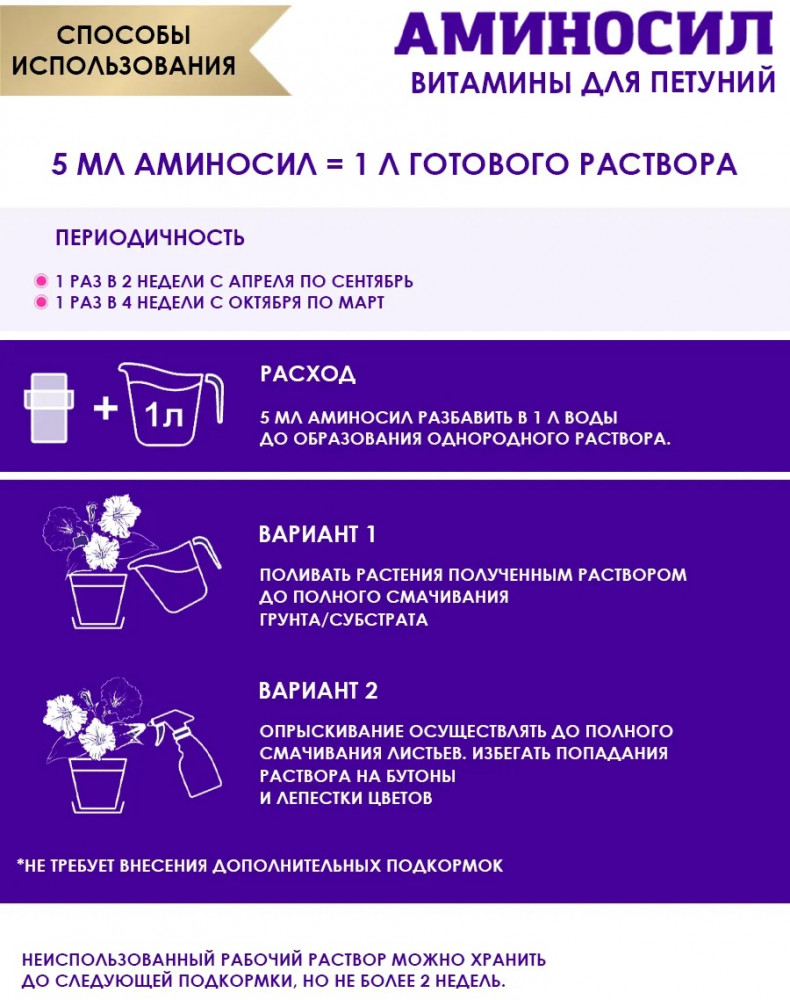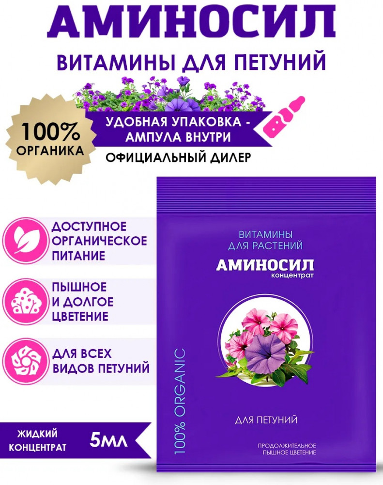 Аминосил Удобрение-контентрат «Витамины для петуний»В данный момент этот товар отсутствует в продаже. Возможно, у нас найдется аналогичный или похожий товар здесь. Витамины для петуний Аминосил подходят для осенней подкормки, представляют собой идеальное универсальное средство для комплексного ухода, питания и удобрения цветов. Их уникальная пролонгированная формула обеспечивает насыщение растений, субстрата и почвы всеми необходимыми питательными элементами, способствуя здоровому росту и развитию. Одним из ключевых преимуществ витаминов Аминосил является их способность укреплять здоровье и иммунитет цветов, делая их более устойчивыми к болезням и вредителям. Это помогает сохранить растения в отличной форме, обеспечивает долгое и пышное цветение. |