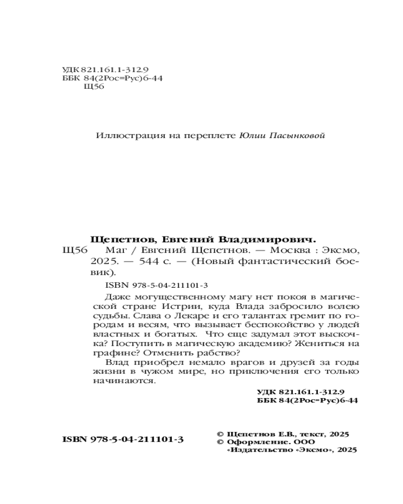 💳 Оплатить за товар можно при получении 🇰🇿 Есть бесплатная доставка по Казахстану от 1 дня 🎁 Копите бонусы с каждой покупки Серия: Новый фантастический боевик. Миры Евгения Щепетнова Даже могущественному магу нет покоя в магической стране Истрии, куда Влада забросило волей судьбы. Слава о Лекаре и его талантах гремит по городам и весям, что вызывает беспокойство у людей властных и богатых. Что еще задумал этот выскочка? Поступить в магическую академию? Жениться на графине? Отменить рабство? Влад заработал немало врагов и друзей за годы жизни в чужом мире, но приключения его только начинаются. |